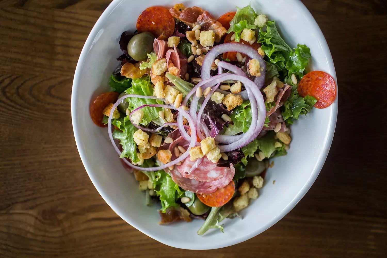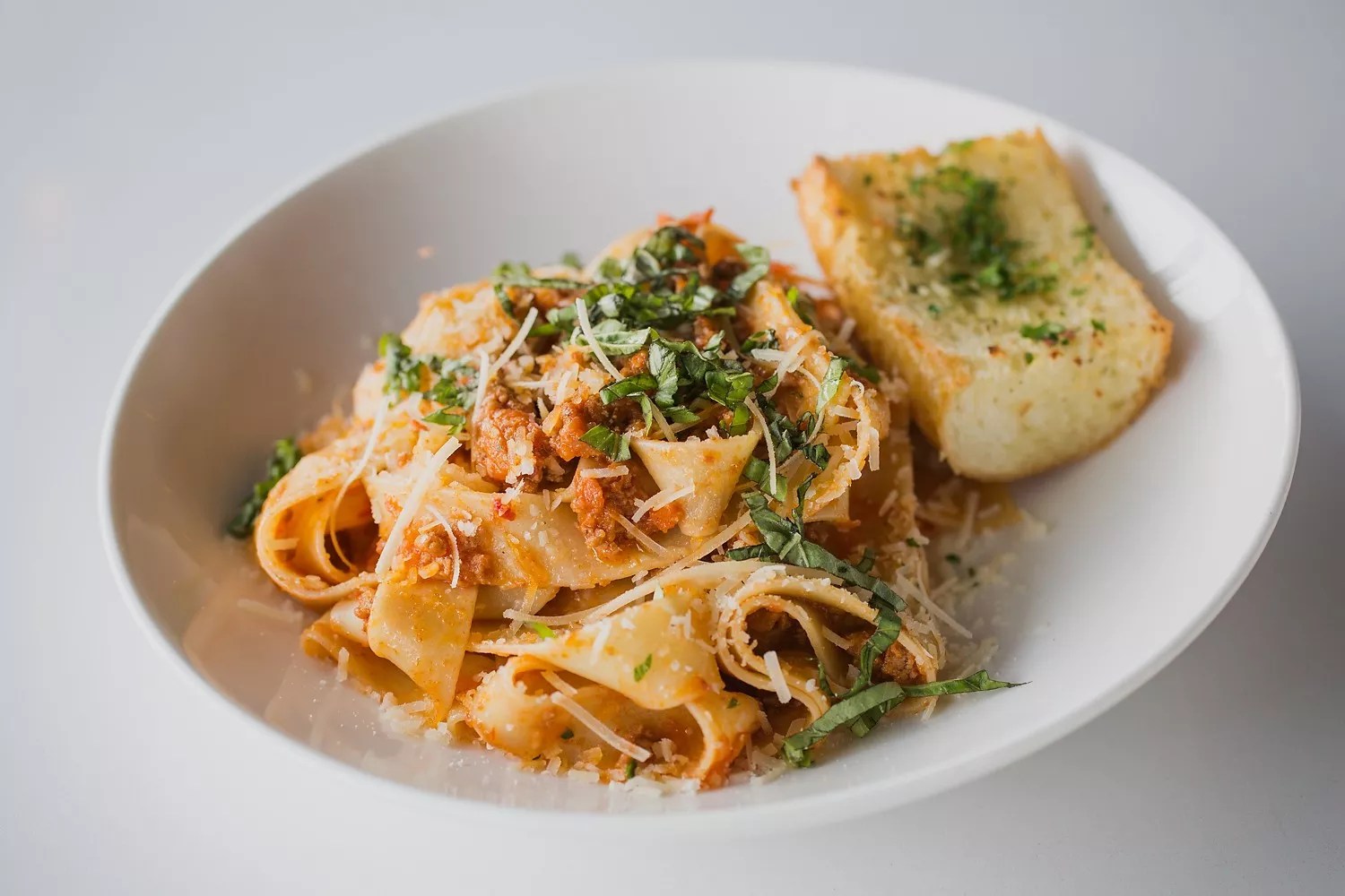 Bruschetta makes a good start to any meal here. Fat slices of puffy Italian bread get a thick smear of goat cheese, artichoke hearts and zigzags of sweet balsamic reduction. Those slices are from the same loaf used for the garlic bread that will later land next to your ravioli, slathered with so much fragrant garlic oil that when people walk in to ViÁ le, they often say, “Wow, it smells good in here.” The burrata isn’t the creamiest you’ve ever had, but it’s a crowd-pleaser all the same, hidden under a cascade of tiny tomatoes in shades of red, yellow and green, with a scoop of pesto that bridges the gap to Caprese salad. For a proper green salad, share the generously sized Italian, with salami coils, pepperoni, Castelvetrano olives and crisp pancetta in a garlicky, ever-so-sweet vinaigrette.