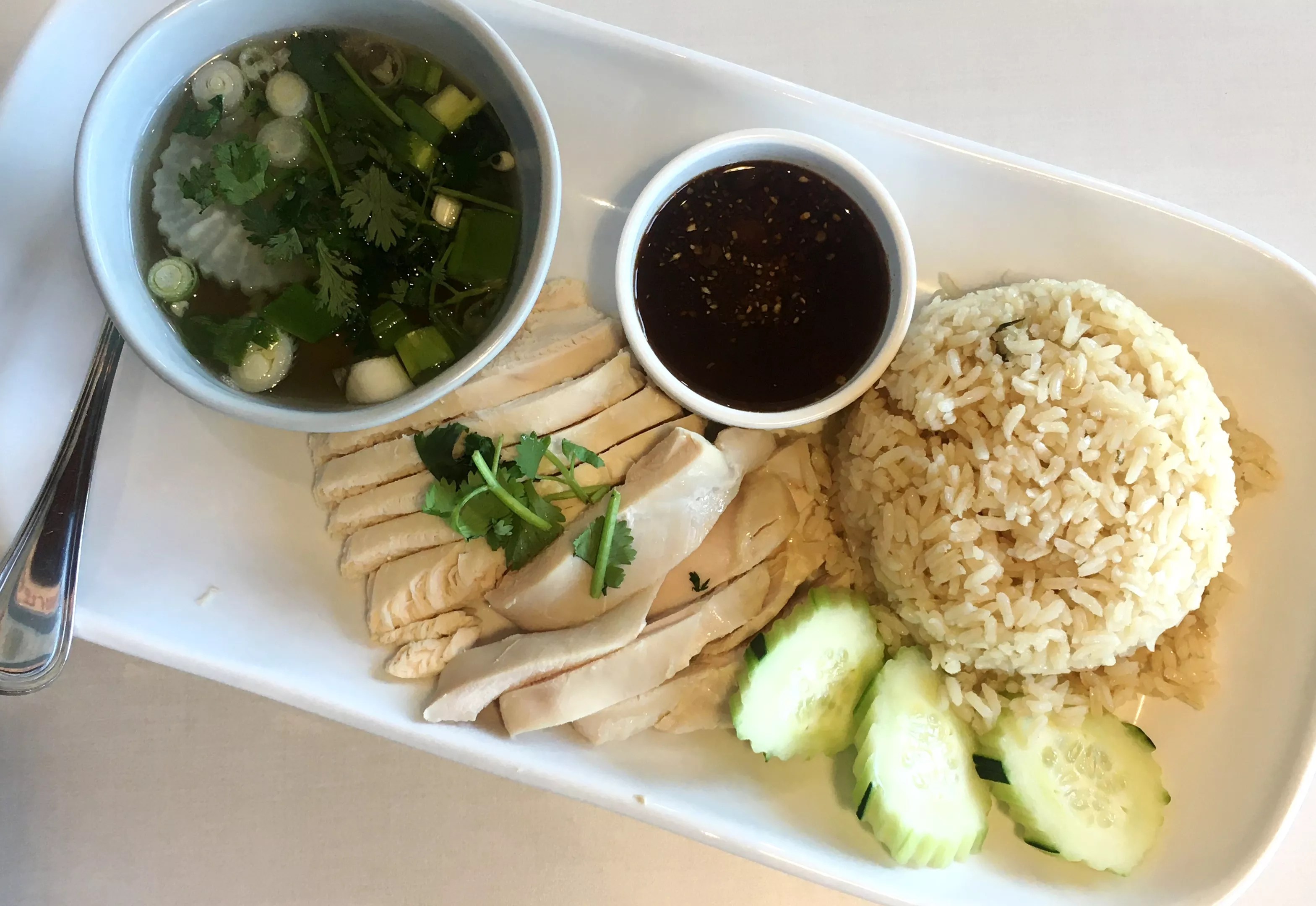Kaw mun kai is an exercise in simplicity, with moist chicken, jasmine rice, a chile-ginger dipping sauce and a side of soup.