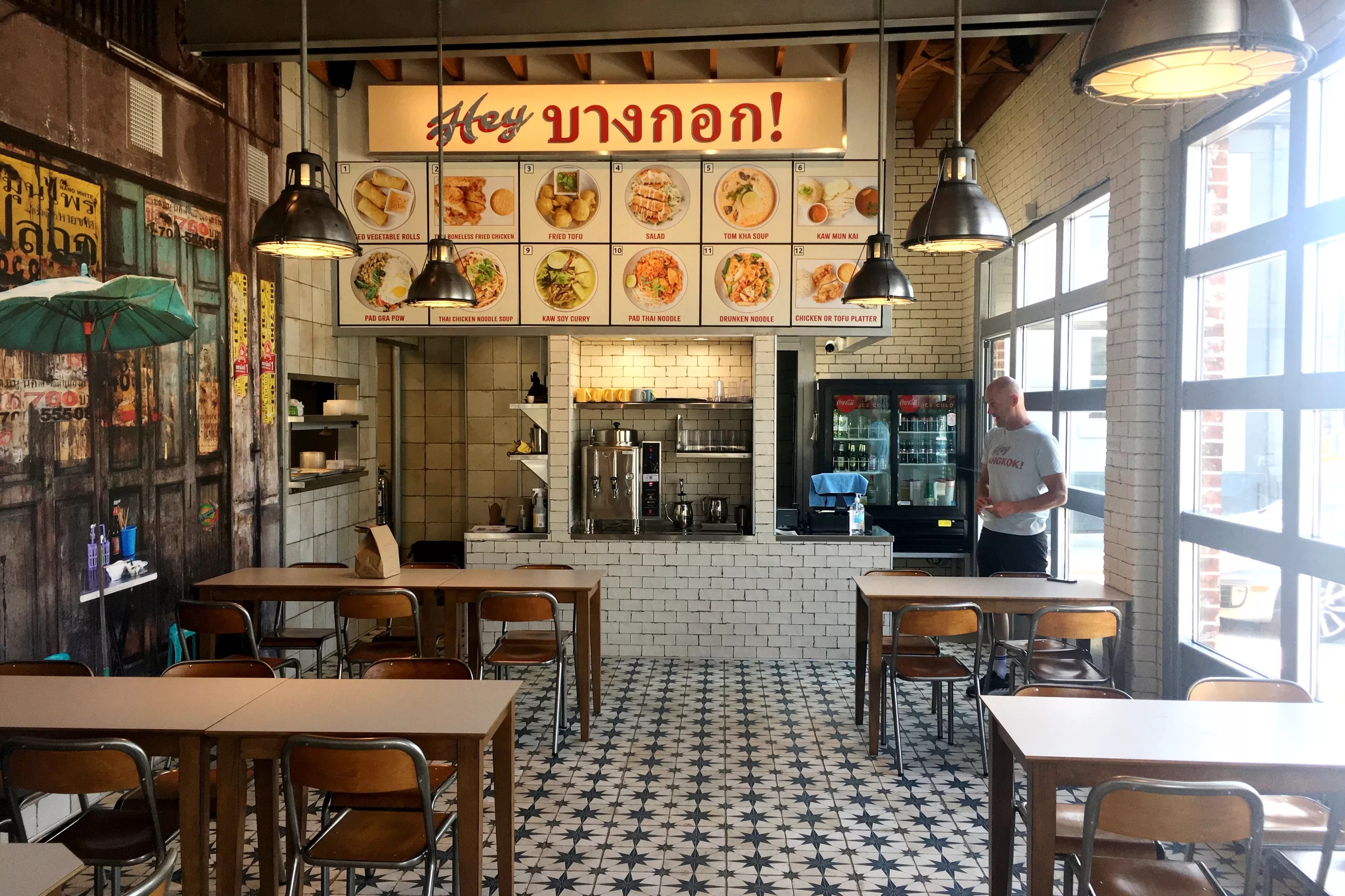 “This was all planned before the pandemic,” Dedrick notes, though the redesign certainly takes social distancing into account. There’s no counter service at Hey Bangkok, and tables are widely spaced for now. A photo mural on the dining room wall depicts umbrella-covered tables in front of a weathered Bangkok restaurant, adding the illusion of depth to the space.