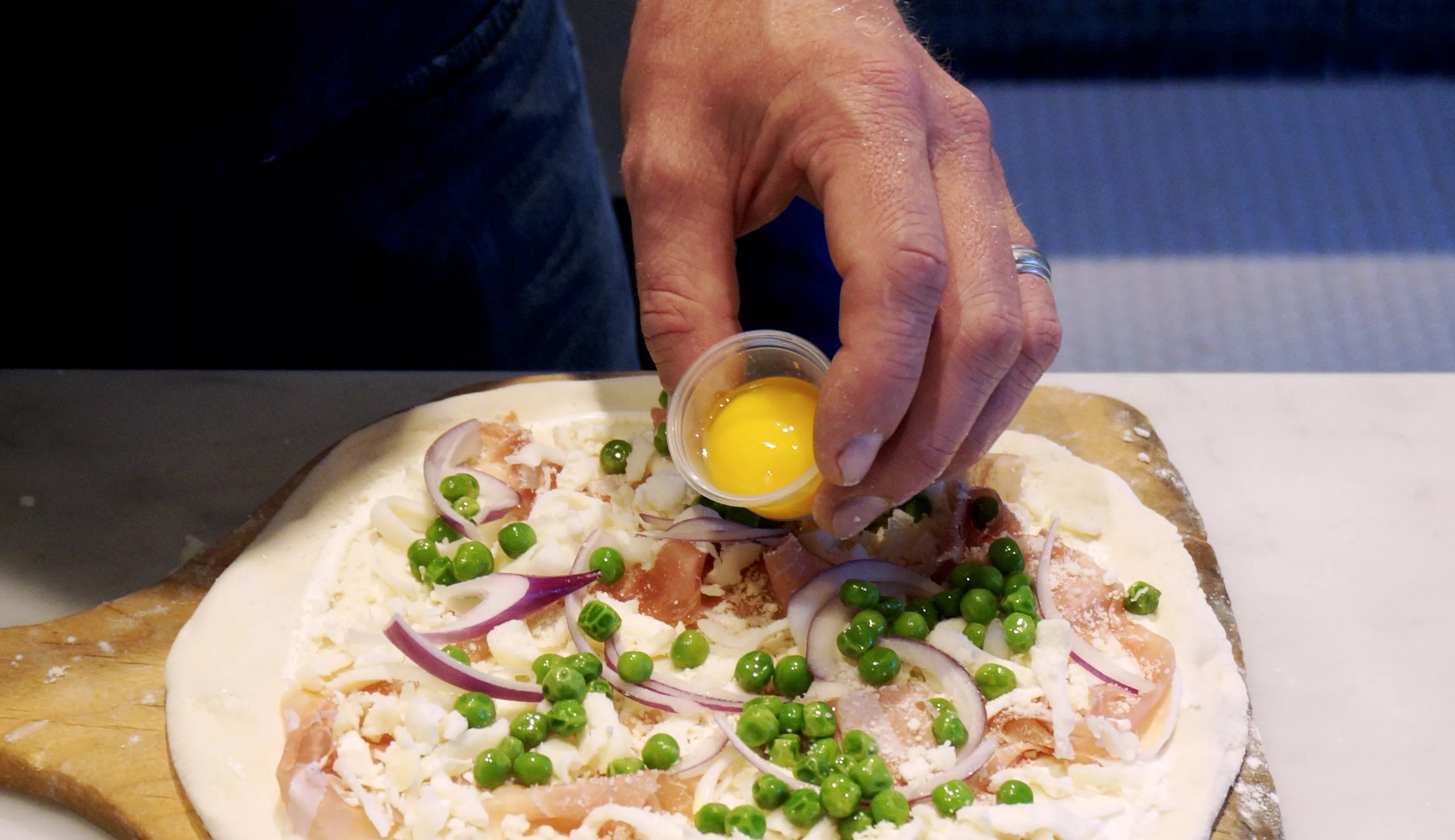 Fruition and Mercantile chef/owner Alex Seidel tops a Pizzeria Locale pie with an egg yolk before it goes in the oven.