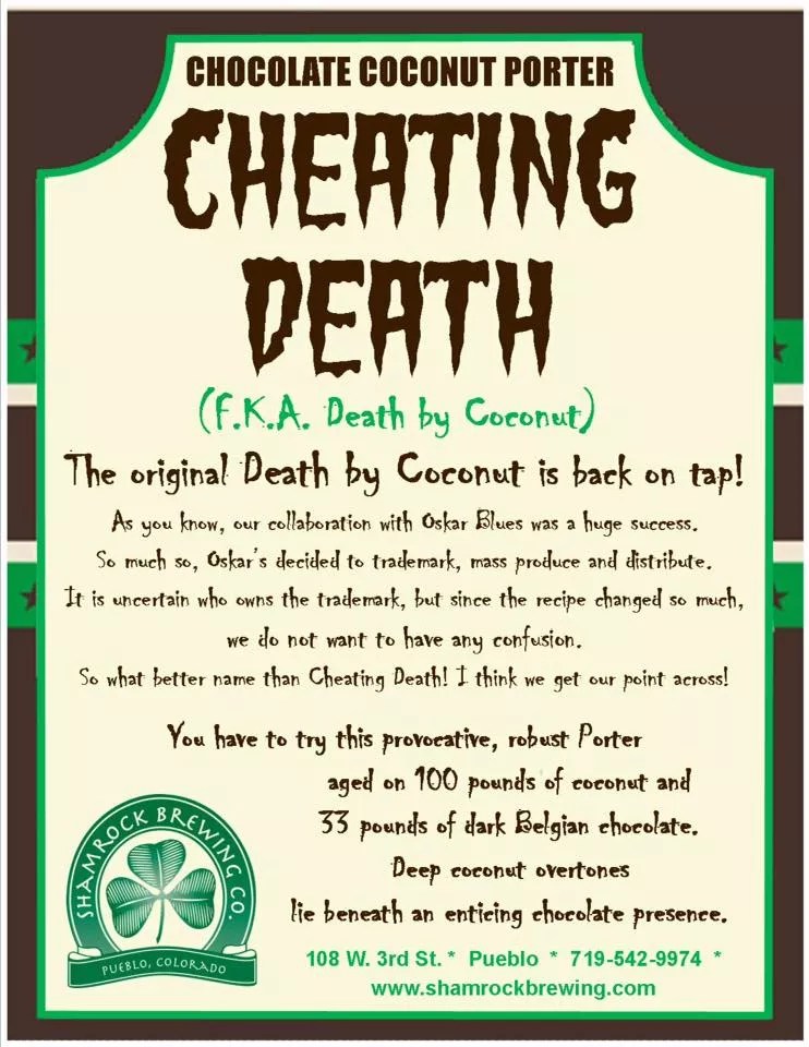 Last September, Shamrock Brewing in Pueblo posted a curious note on its Facebook page about the upcoming tapping of a beer called Cheating Death Chocolate Coconut Porter.