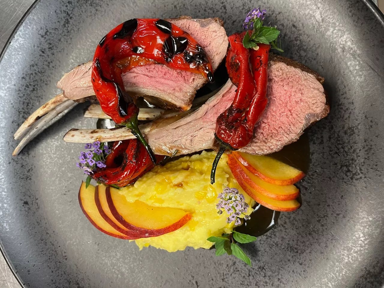 A dish by chef Jennifer Jasinski: Colorado lamb, Olathe corn polenta, Palisade peaches and charred Jimmy Nardello peppers.