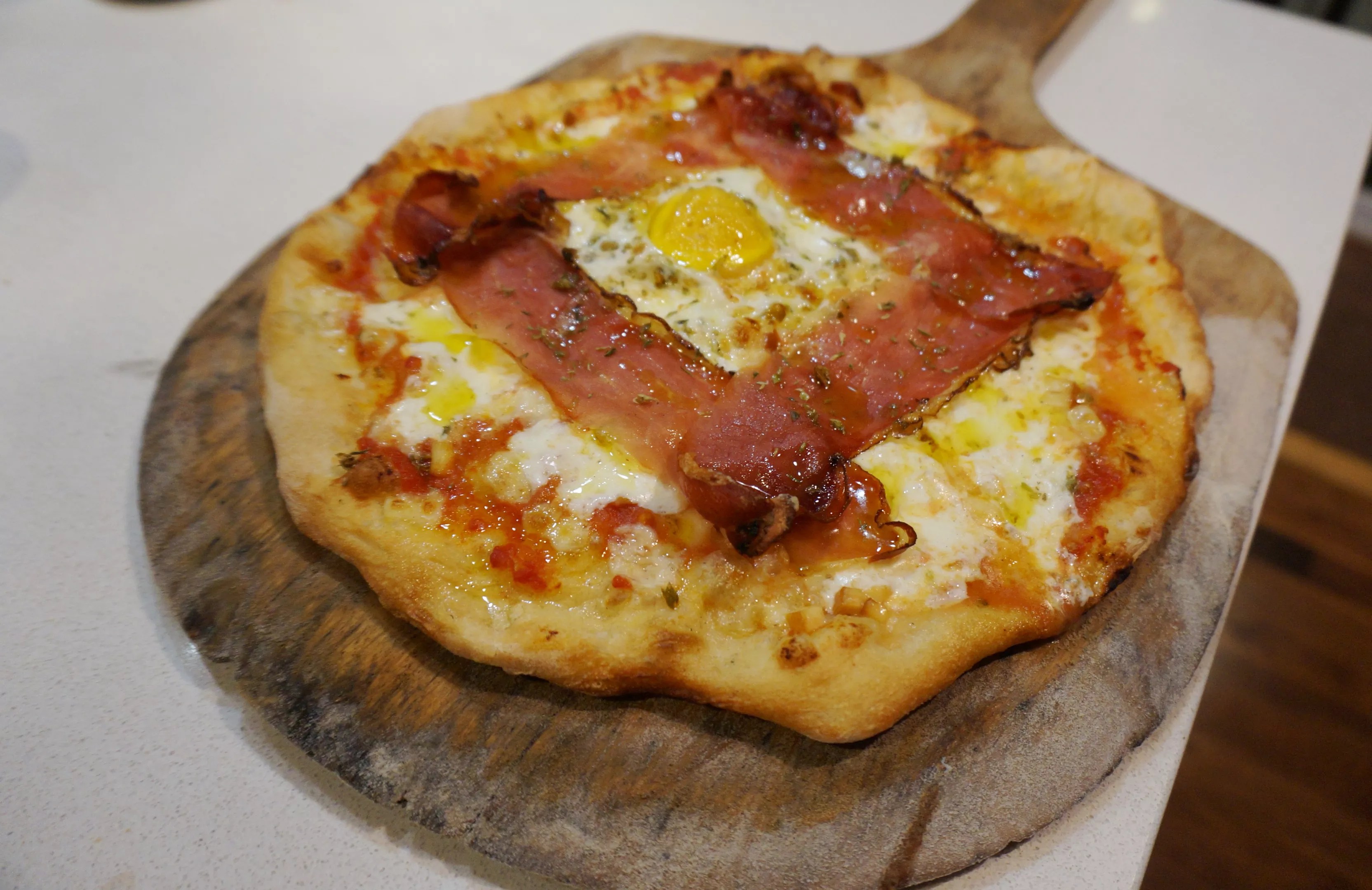 Wood-fired pizza with speck, smoked mozzarella and an egg.