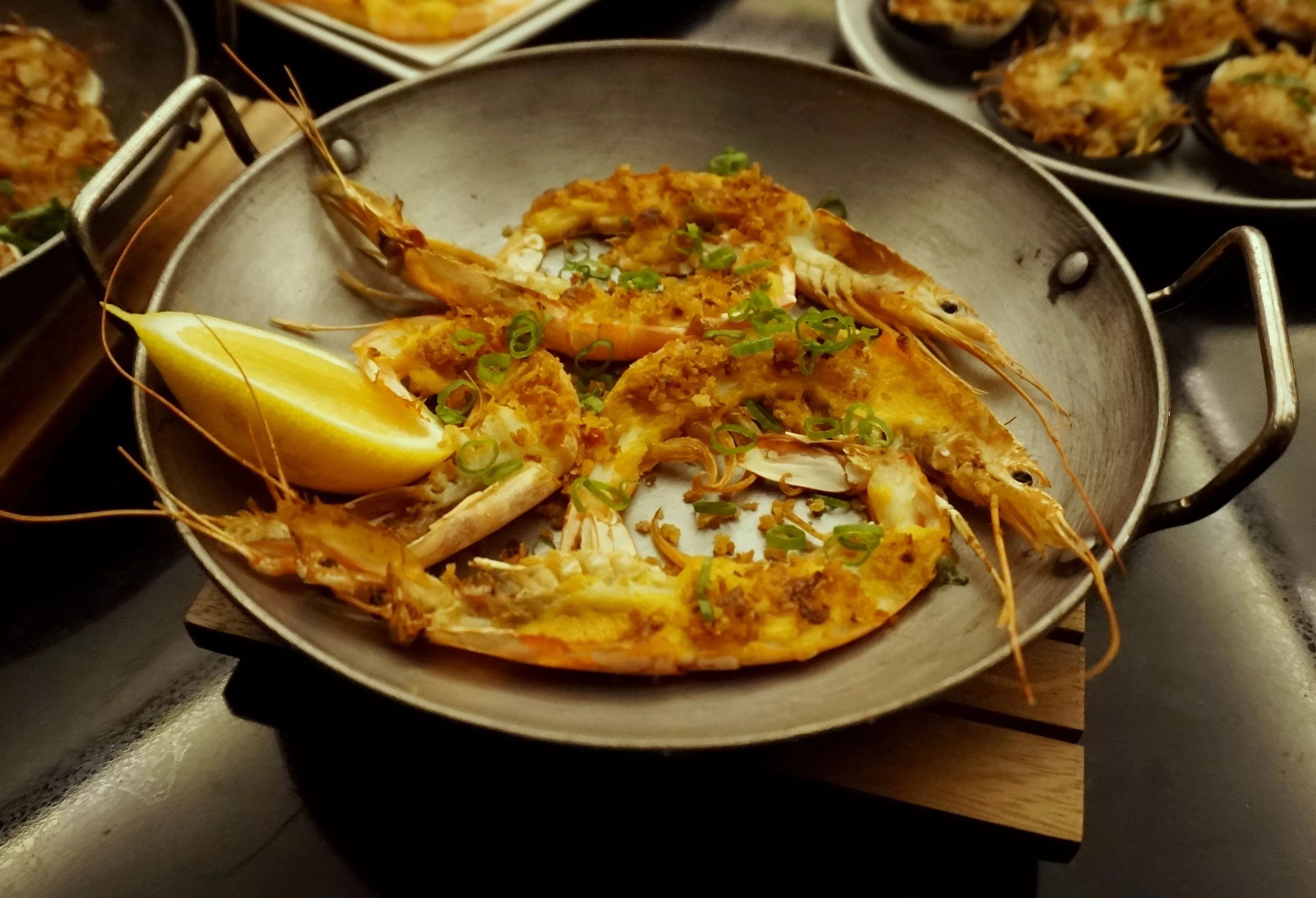 Whole prawns split vertically and baked with uni butter.