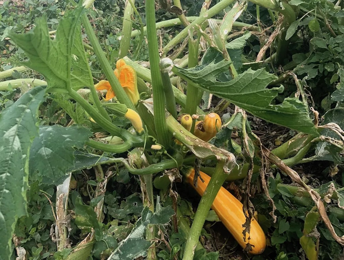 Squash plants regenerating after hail damage at ACRES at Warren Tech.