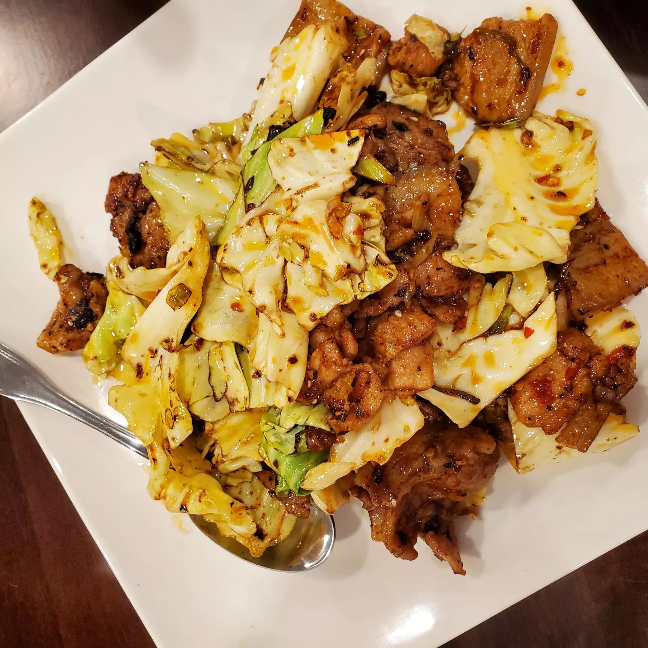 Double-cooked pork with cabbage ($15.95) also brought a fair amount of heat and was studded with fermented black beans, which added a complex richness to the dish.