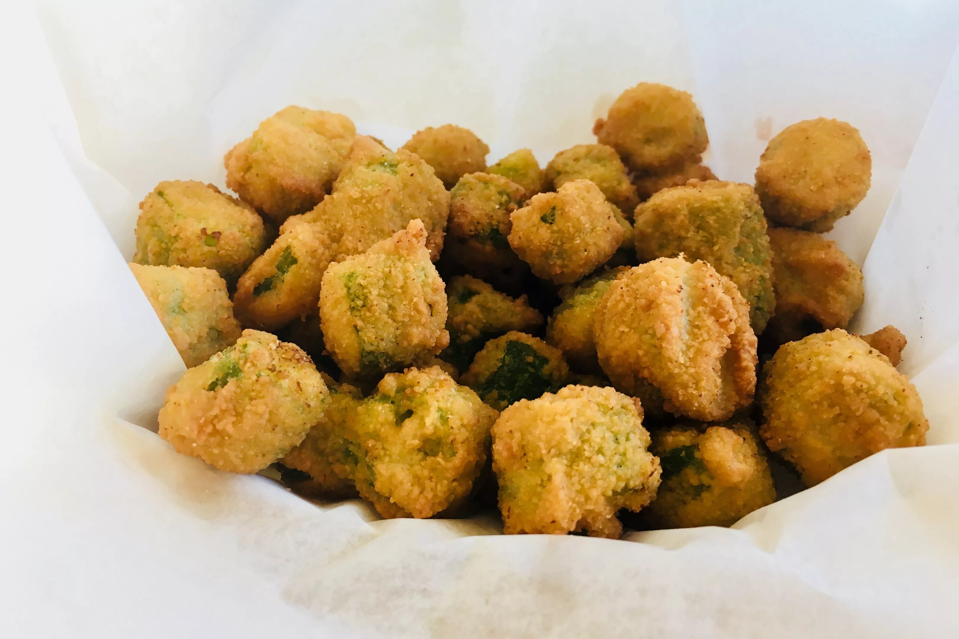 The fried okra may not be hand-breaded, but they’re good.