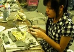 Clay artist Marie E.v.B. Gibbons works in the studio, where she also holds workshops and classes for the public. On First Fridays, she offers a new “object” for passersby to try and mold out of her favorite medium.