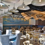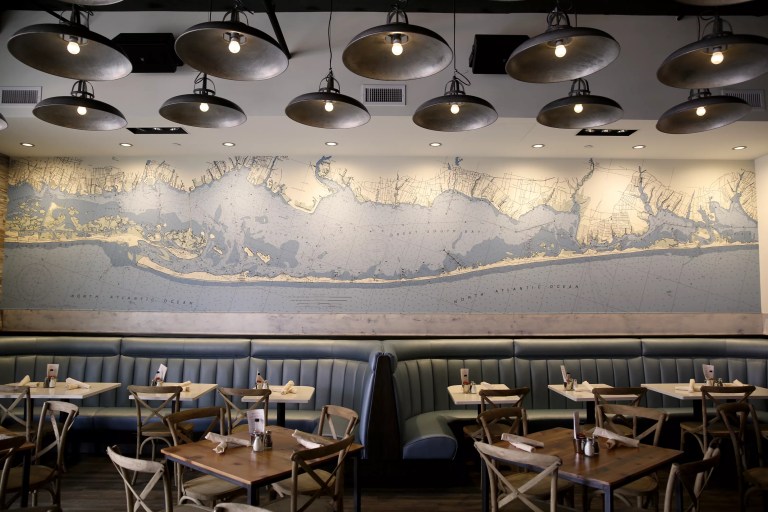 The interior of Blue Island Oyster Bar captures the feel of a New England seafood house, albeit with Cherry Creek influences. Weathered chairs and barstools contrast with a sleek and clean-lined oyster bar, while dim architectural light fixtures shed a rippling, underwater glow on mural-sized maps and photos. The menu toes the same line, with fish-shack favorites like fried clams and jumbo shrimp sharing menu space with more of-the-moment dishes such as “Thai-style” fish served with coconut and curry risotto and prik nam pla, a dipping sauce made from chiles and fish sauce.