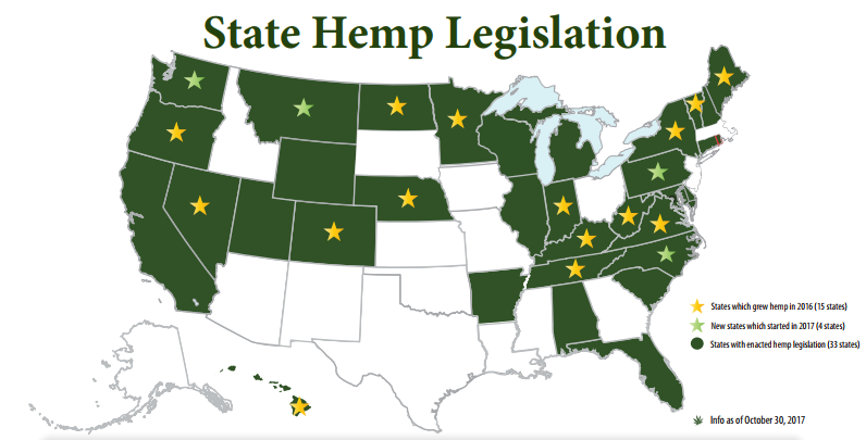 “We’ve seen hemp cultivation significantly expand in the U.S. in 2017, with over double the number of acres planted in hemp compared to last year and the addition of four more states with hemp pilot programs,” Vote Hemp president Eric Steenstra says. “The majority of states have implemented hemp farming laws, in clear support of this crop and its role in diversifying and making more sustainable our agricultural economy.”