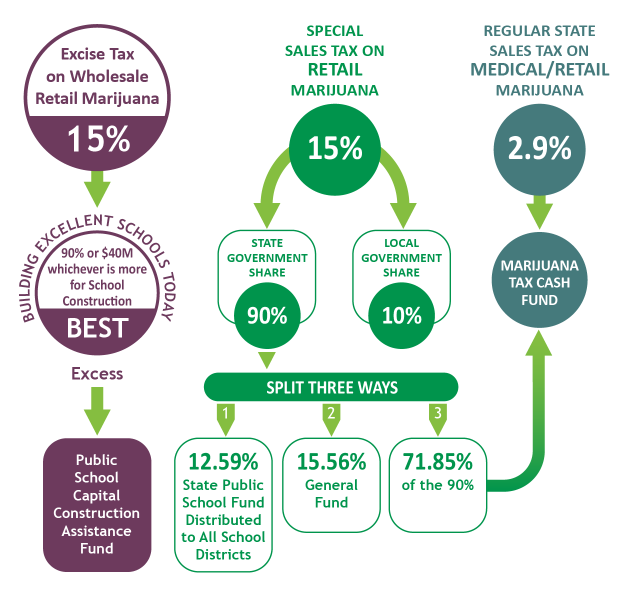 Public education in Colorado receives marijuana tax revenue through the state’s Building Excellent Schools Today (BEST) fund — a matching grant program — and the Marijuana Tax Cash Fund. Local governments can distribute their own marijuana tax revenue to schools, as well. The BEST fund annually receives either $40 million or 90 percent of the state’s 15 percent wholesale and excise tax revenue on recreational pot sales, whichever is greater.