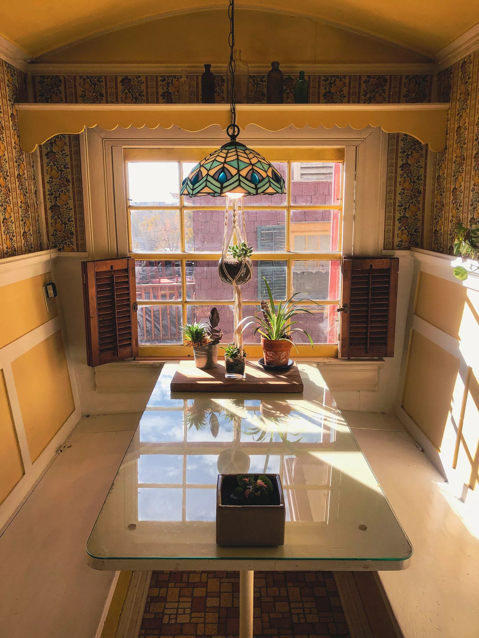 The living room was covered with beige wallpaper, its fireplace surrounded by tiles depicting a waterfront town. There was a solarium with a stone floor, stained-glass ceiling and ornate wood trim. The kitchen had yellow patterned wallpaper — on the walls and the ceiling — as well as bright-yellow counters, bright-orange cabinets and a somewhat matching yellow-and-orange tiled floor. The master bedroom upstairs was blush pink.