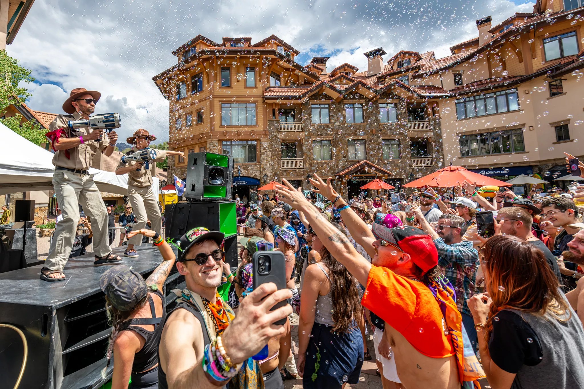 Saturday kicked off with a surprise pop-up at Heritage Plaza in Mountain Village, where Freddy Todd got the crowd moving before Of The Trees unleashed his Odds & Ends set, turning the square into a bubble-filled dance party.
