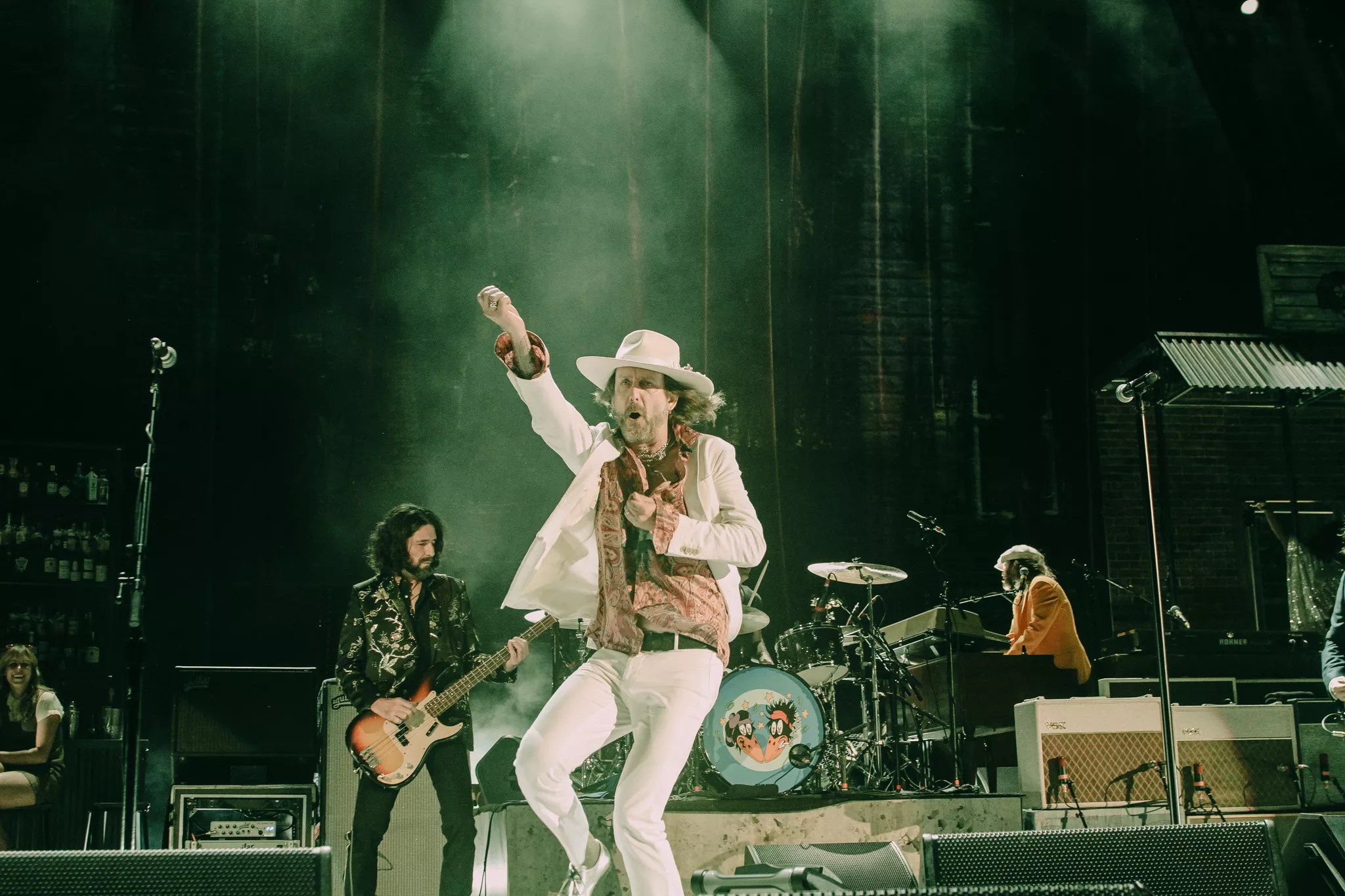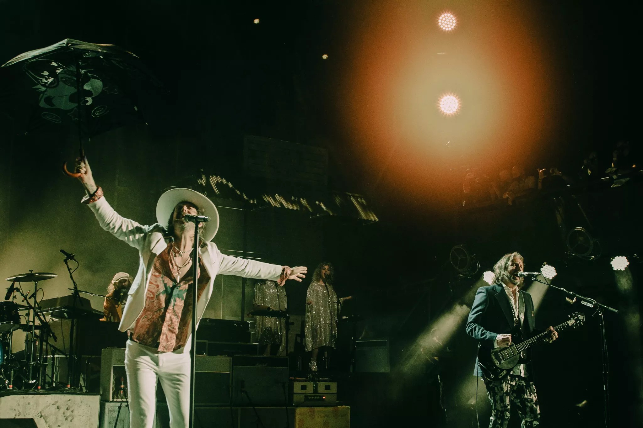 Chris sat behind a Black Crowes umbrella as the band took the stage. Rich fired up the first few chords in open-G tuning of “Twice as Hard,” the opening track to Money Maker. The rest of the band kicked in, and a jolt of energy blasted from the stage as Chris came out from behind the umbrella and began dancing in his white suit and hat and silver shoes. Meanwhile, Rich, standing on stage left with a blank expression, almost looked bored, occasionally watching his brother prance.