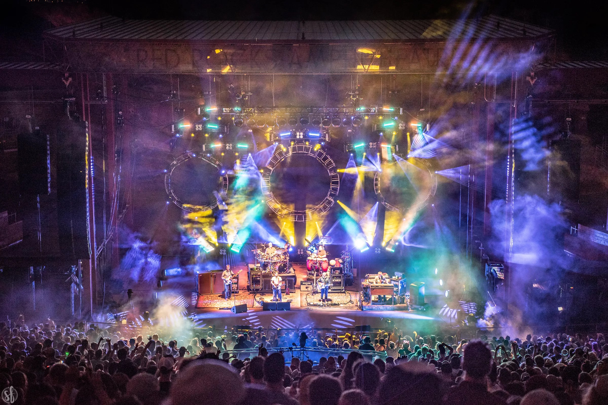 Members of Hot Rize and String Cheese Incident sharing the stage at Red Rocks.