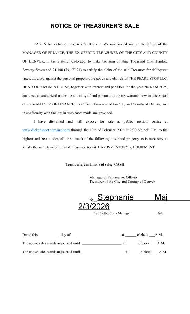 The controversial Capitol Hill club, which was seized by the city in December for non-payment of taxes, is now up for auction. The Denver Manager of Finance posted a public notice today, February 3, announcing that The Pearl Stop LLC dba Your Mom’s House has been scheduled for auction on February 13. The notice cites an outstanding amount of $9,177.21 “to satisfy the claim of said Treasurer for delinquent taxes,” along with interest.