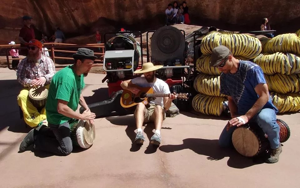 The drummers who participate in Denver Drum and Dance‘s weekly drum circle typically gather at Denver Art Society on Sunday evenings. But for April, they have been spending Sunday afternoons drumming on the Red Rocks Amphitheatre stage.