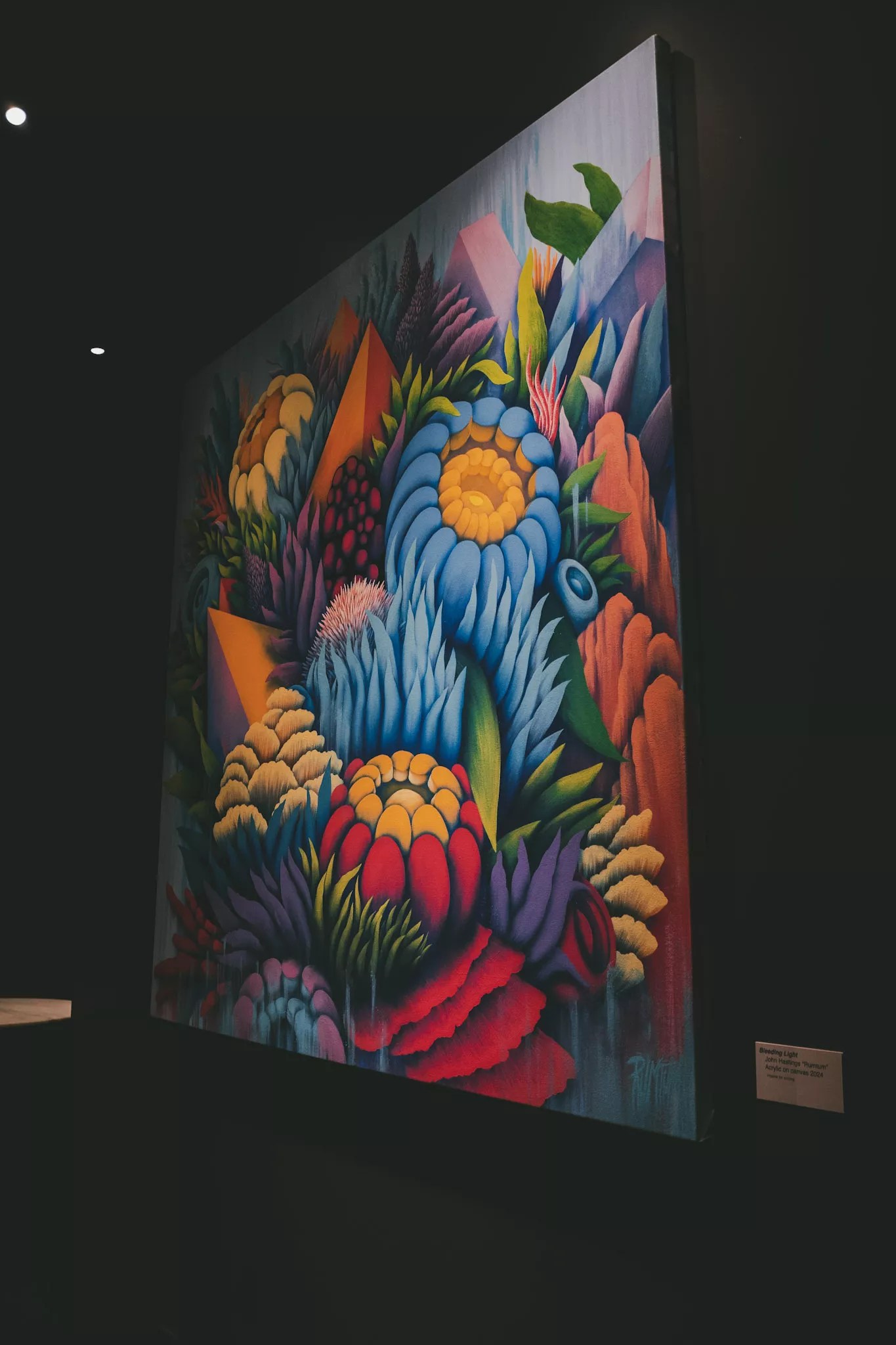 Now, hundreds of shows, murals, drawings and paintings later, Hastings is doing just that. The three massive paintings that he debuted at the December listening party were the products of his first time intentionally creating artwork inspired by his music. Each canvas shares its title with a track from Glue of Everything, and each transports viewers into an entirely new realm, with audiences also receiving a sneak peek at unreleased tracks.