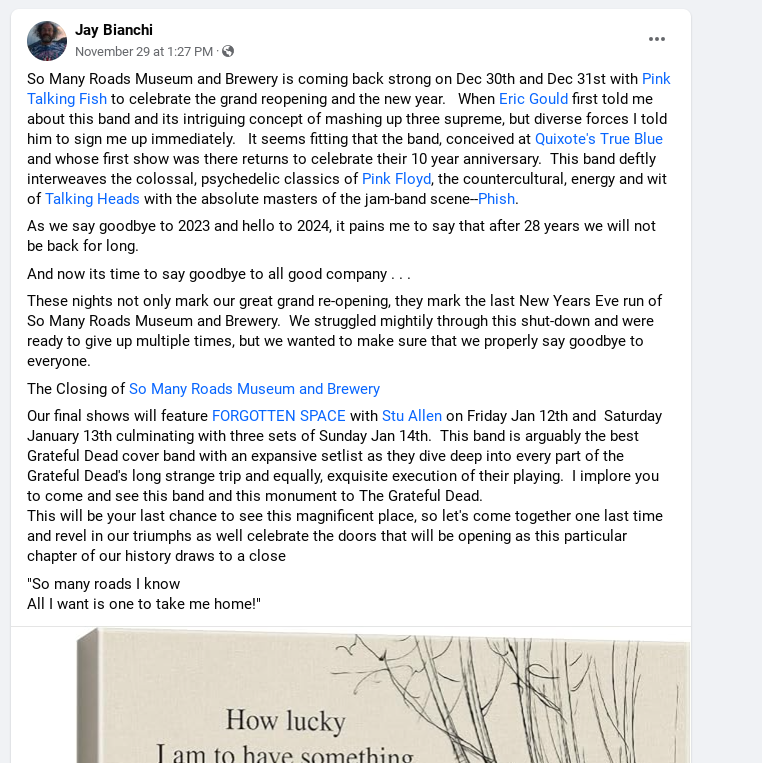 While So Many Roads did not come entirely to the end of the line, it will be on shifting ground when it reopens for New Year’s shows on December 30 and 31 with Pink Talking Fish, which covers Pink Floyd, Talking Heads and Phish. Bianchi again took to Facebook, writing, “These nights not only mark our great grand re-opening, they mark the last New Years Eve run of So Many Roads Museum and Brewery.”