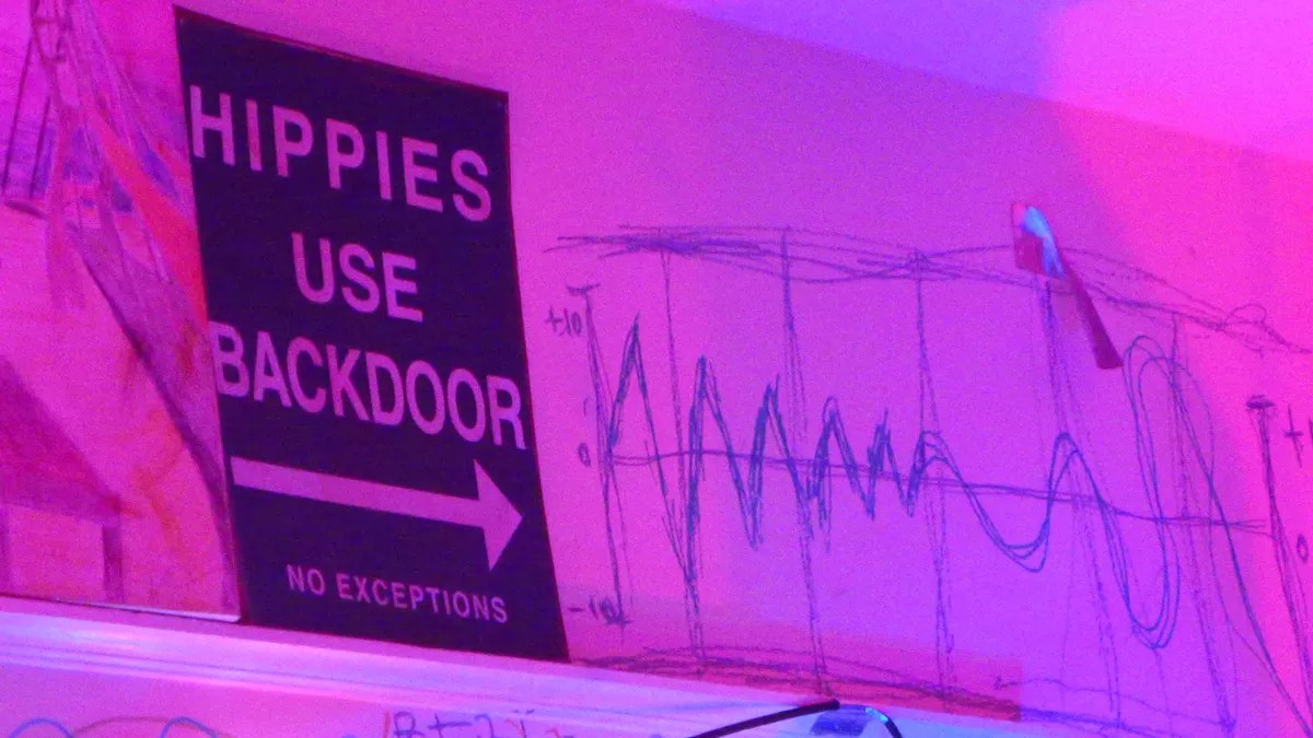 A “Hippies Use Backdoor” sign hung above to entry to the kitchen at Moon Magnet.