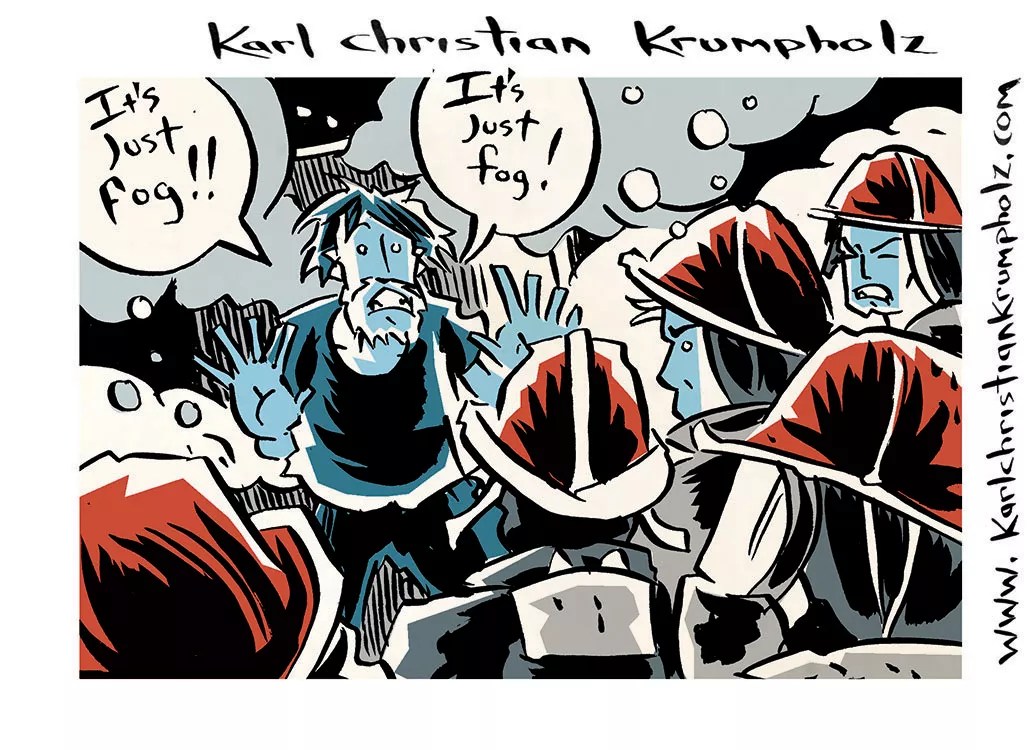 “Stopping momentarily to adjust, we suddenly noticed a flashing red light on the ceiling. Before anyone could speak, the alarm system started a light-and-sound show of its own. Because it was tripped by a smoke detector, it took a few minutes to turn off. Silence…and then back to practice. We were about two minutes into the second song when the windows bloomed with flashing blue and red lights and sirens completely engulfed our sound. Then came a harsh rapping at our chamber door. Try explaining to ten fully geared-up firemen with axes that you were just playing around with your fog machine…” Karl Christian Krumpholz