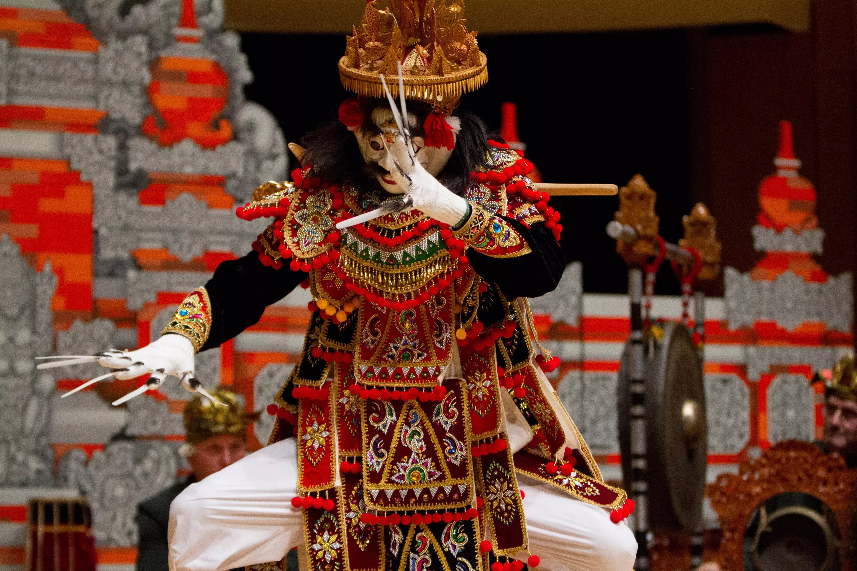 Other instruments in the ensemble include double-headed drums, large gongs, hand-held cymbals, flutes, percussive pots played with sticks, and a melodic instrument called the trompong. The latter requires four people to play it, as it is a long apparatus with a row of metal, kettle-like gongs mounted on a lavishly carved large wooden frame.