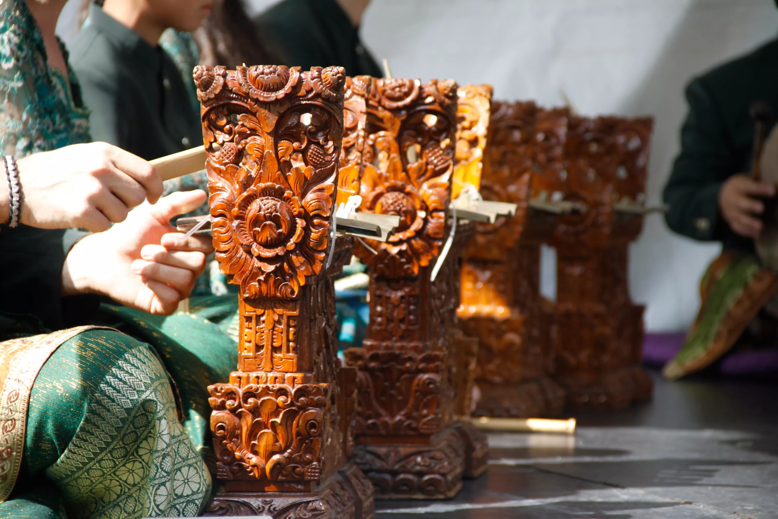 The highly rhythmic Gamelan music of Bali uses various gongs, drums, and bronze metallophones (pictured) encased in ornate hand-carved jackfruit wood.