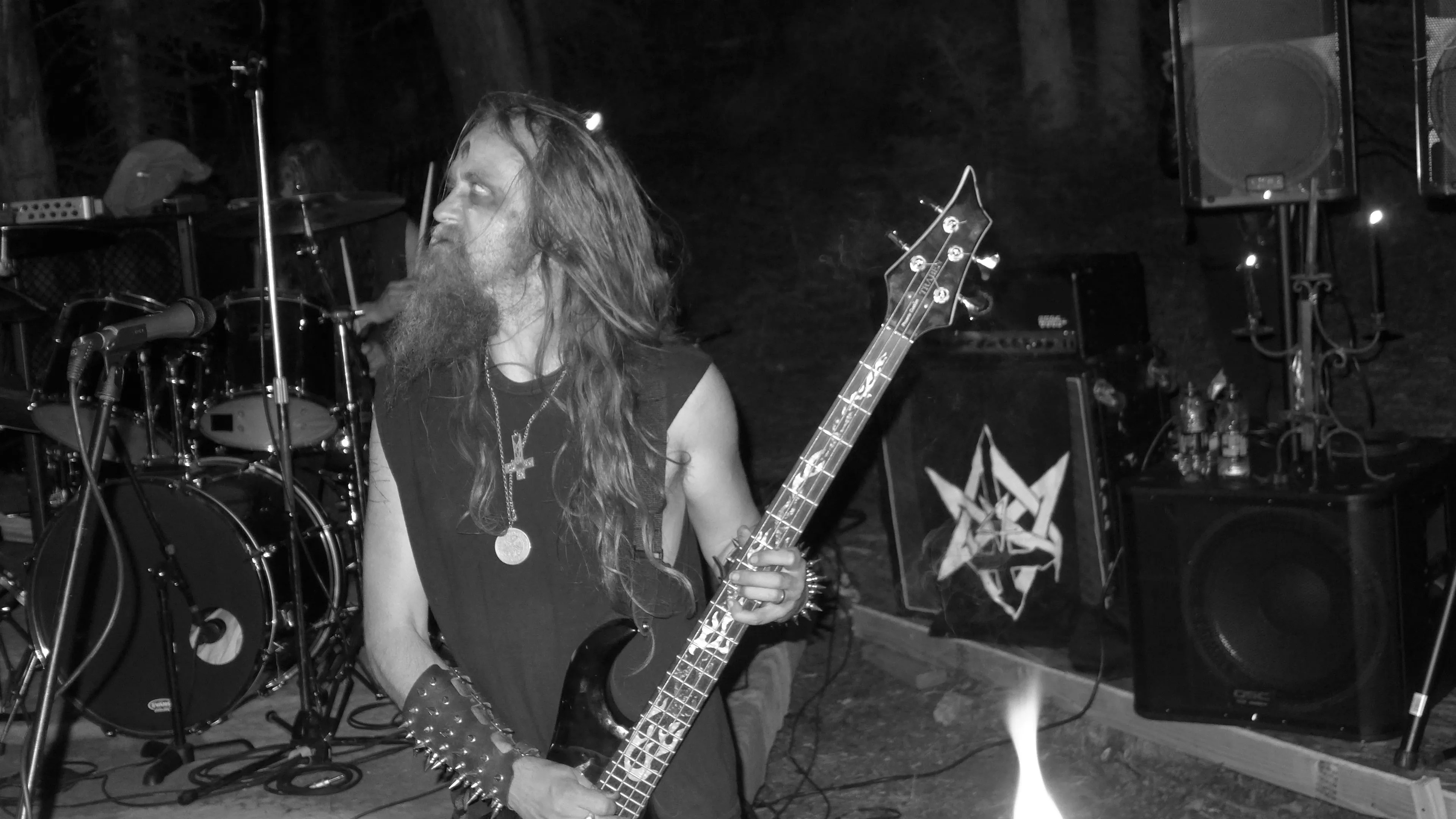 When I arrived at the festival, I could hear the abrasive low end rumble of Demonic Christ. The setting was small, the stage in a clearing surrounded by trees, lit only by tiki torches. Demonic Christ, which has been around since 1992, looked the black-metal part, with the bass player sporting spiked bracers. Vocalist Dana Duffey made a pointed statement about dedicating a song to all the social-justice warriors that weren’t at the show. That surely tongue-in-cheek remark was the only truly political statement I heard at the festival.