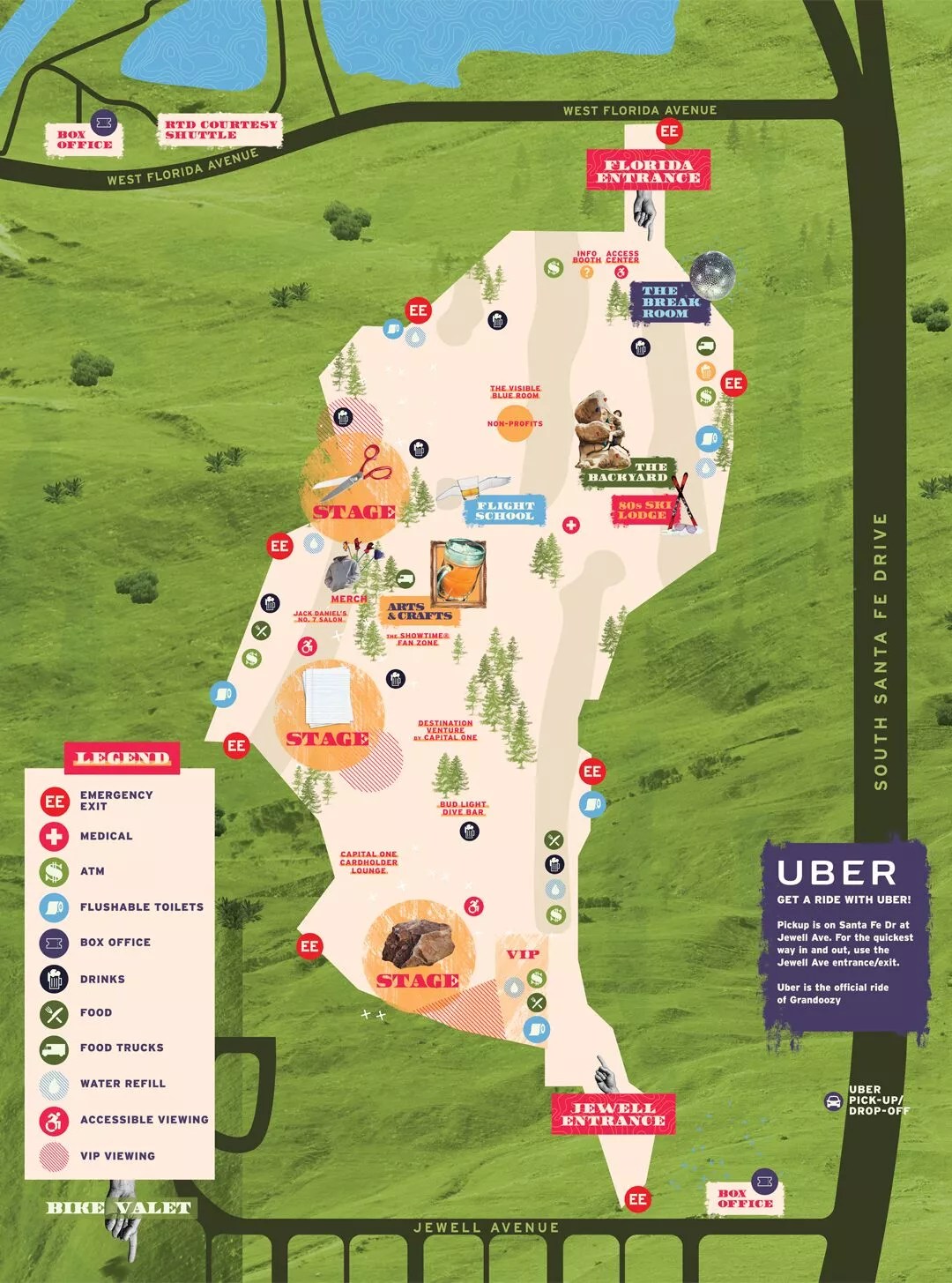 1. Ride RTD rail or bus. Disembark at I-25/Broadway; Grandoozy is providing a free shuttle service from there. Get off at the Evans station, and follow a walking path to the festival entrance.