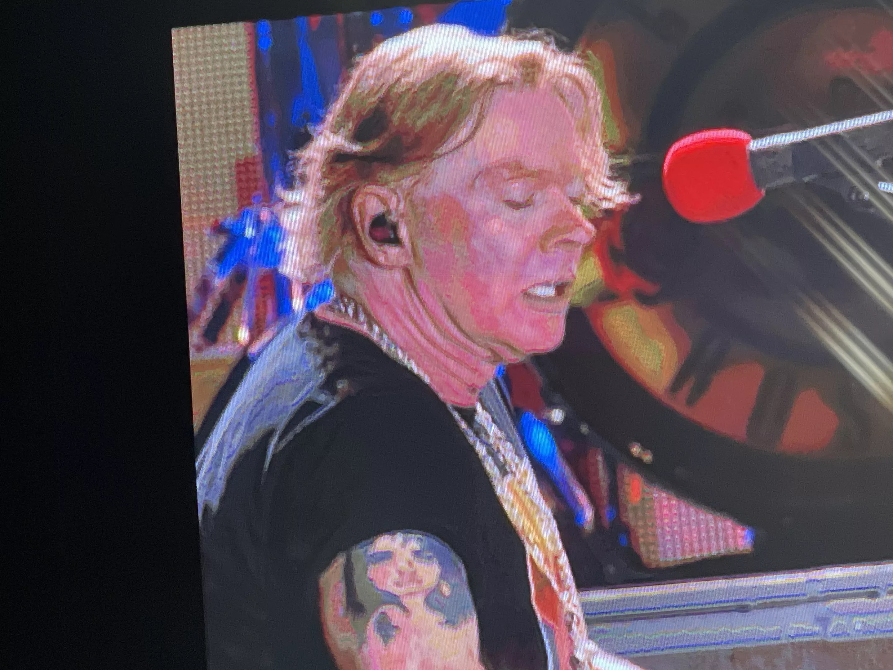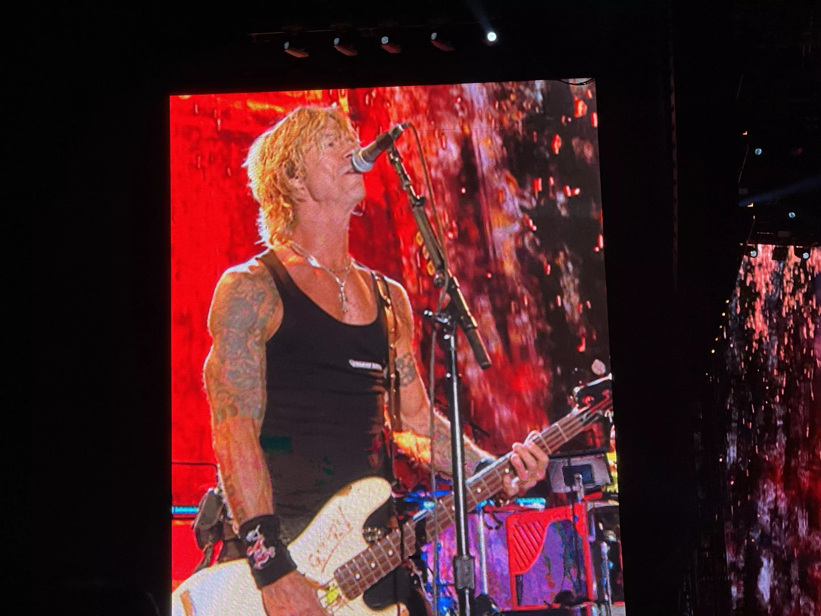 The kid in front me at the show, probably still in elementary school, couldn’t get enough. Though it was the night before his first day of classes, he was standing on his seat, swaying his arms, banging his head and shooting the sign of the horns. Hail Satan, he grinned. He mugged for a photo with middle fingers drawn toward his mom’s smartphone and then made friends with a group of stoned, drunk adults who were wearing headbands in honor of Axl Rose. The five of them partied together till the adults left (to avoid parking-lot gridlock) and the kid, worn out, slumped in his seat as Rose crooned “Patience” and “Paradise City” for the encore. That child wasn’t the only die-hard fan tuckered out — but the band raged till the end.