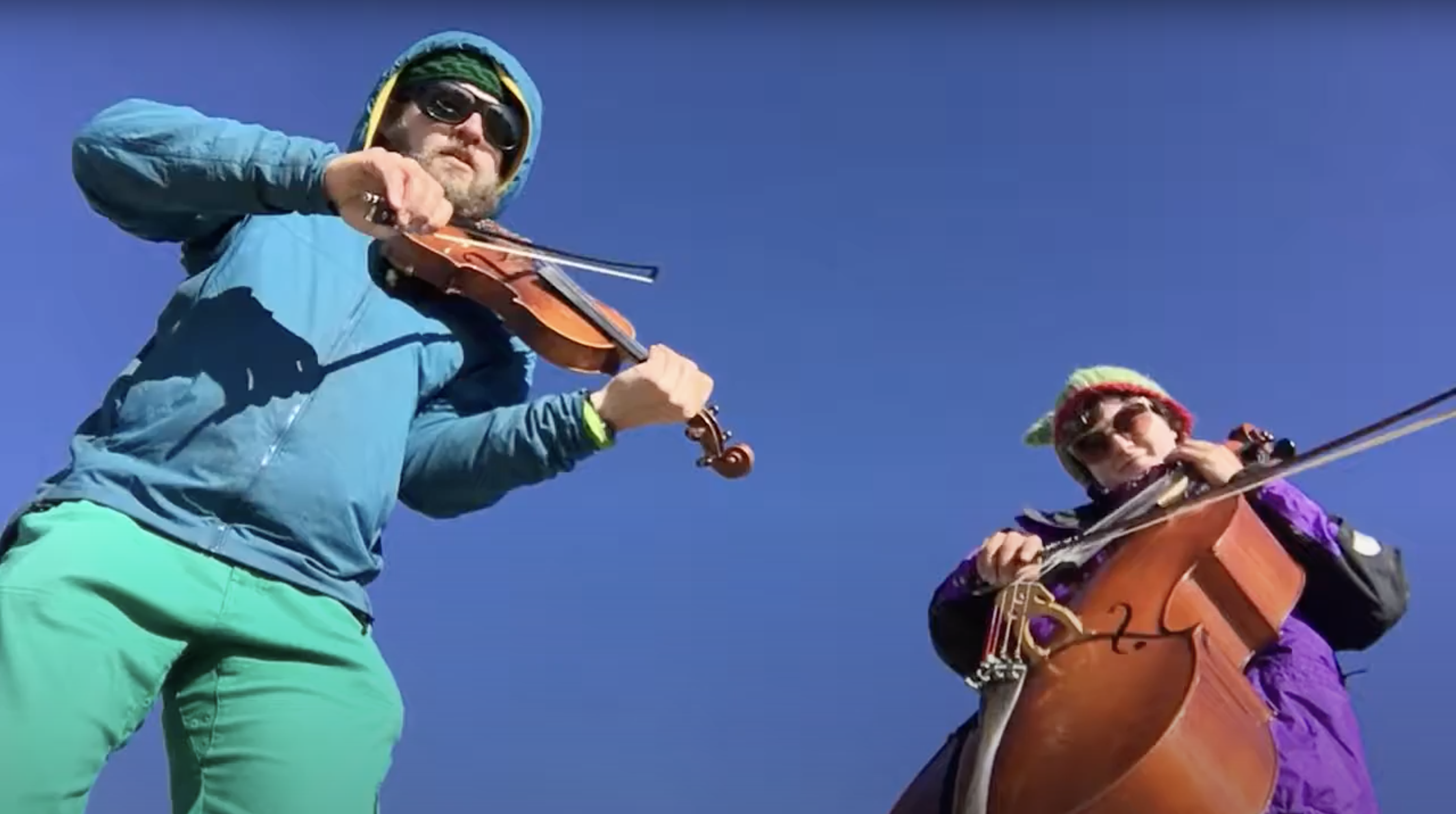 A key part of the mountain performance is the arsenal of stunt cellos, fiddles and banjos the musicians employ. They’re hardier than the instruments used on pro gigs, and better lend themselves to the expression of the moment, allowing the couple the freedom to play without fear of damaging their more delicate counterparts as they wind their way up and down mountains.