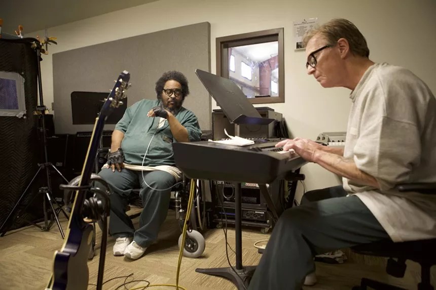 Kevin Woodley, left, watches Michael Tenneson play the keyboard during a 2018 recording session at Territorial Correctional Facility in Cañon City.