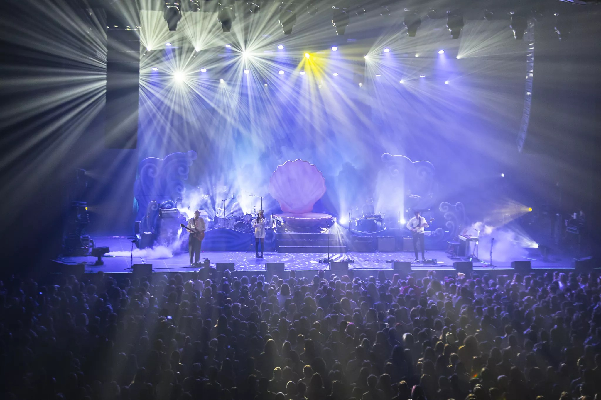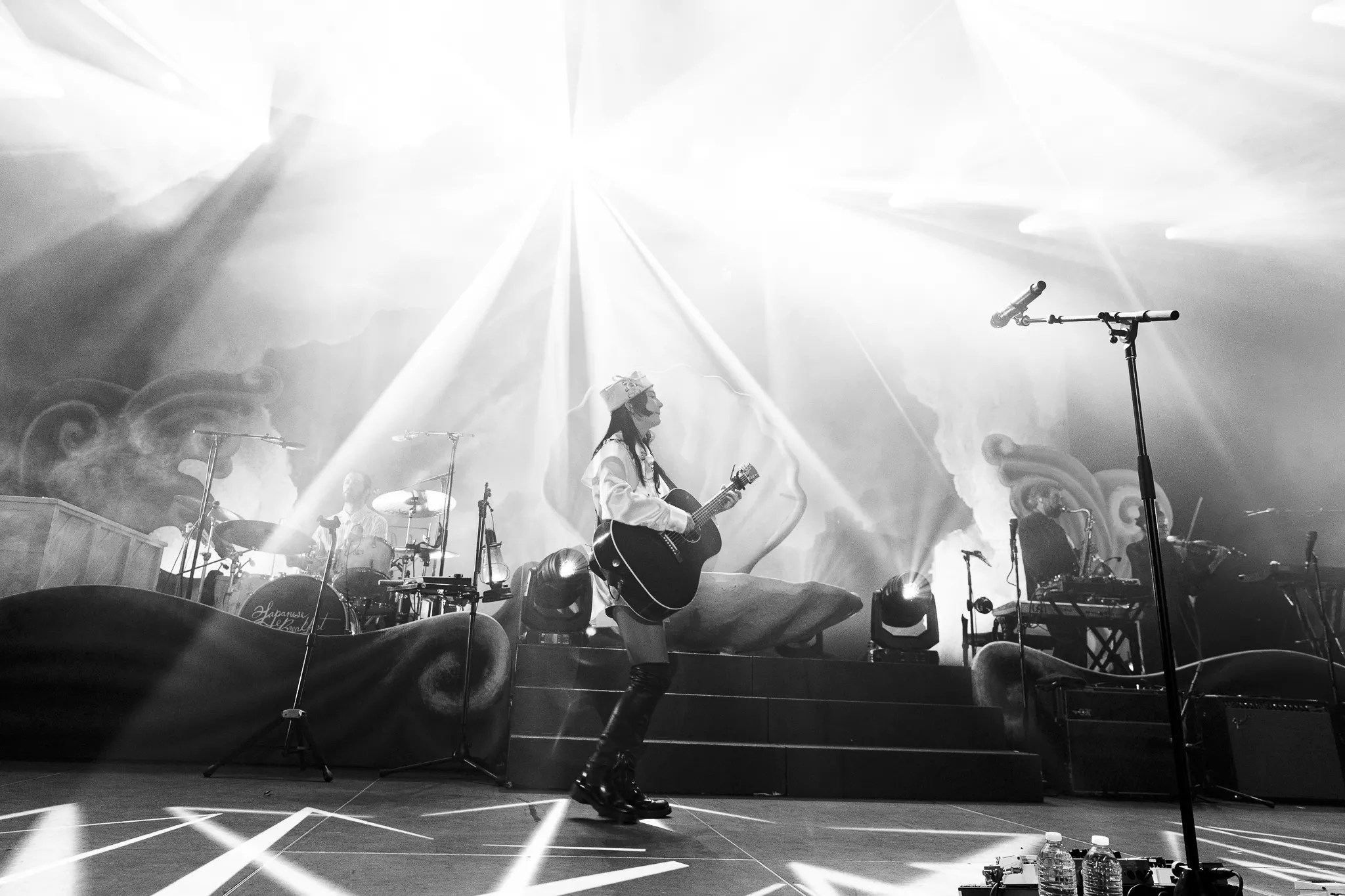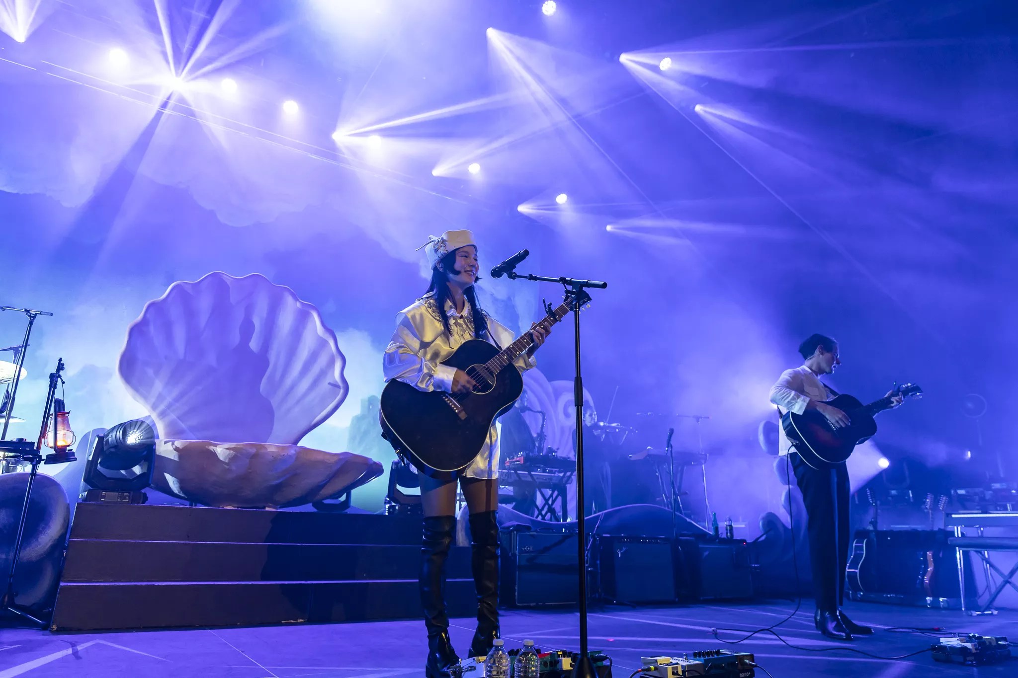 After a short break, Japanese Breakfast took the stage to a dreamy string intro in mostly total darkness, save for a lantern carried by Zauner. The nautical stage called back to the birth of the goddess Venus, with a giant pink clam in the center and large stage props painted to look like waves crashing around the outskirts of the stage, all in front of a massive, cloud-painted backdrop. As Zauner waltzed to perch on the front of the clam, the band opened with an impassioned live version of Melancholy opener, “Here is Someone.”