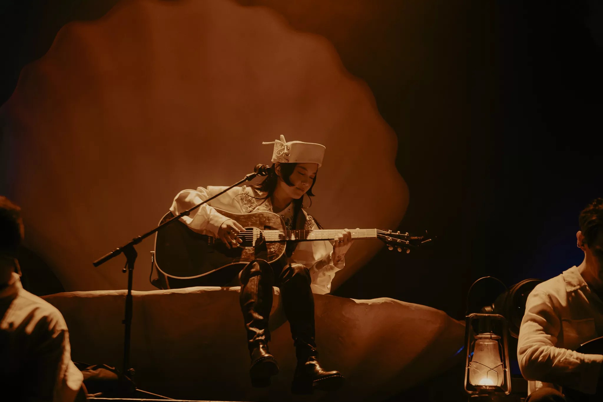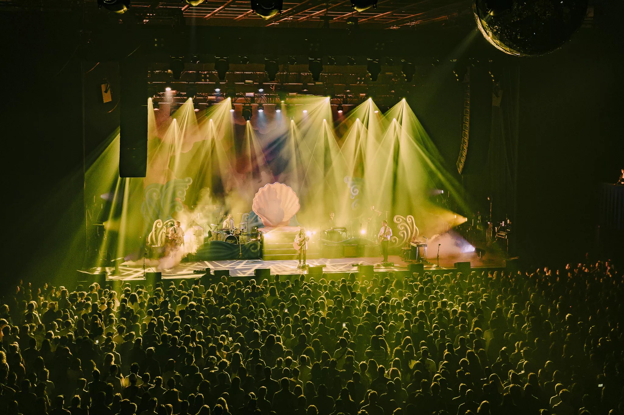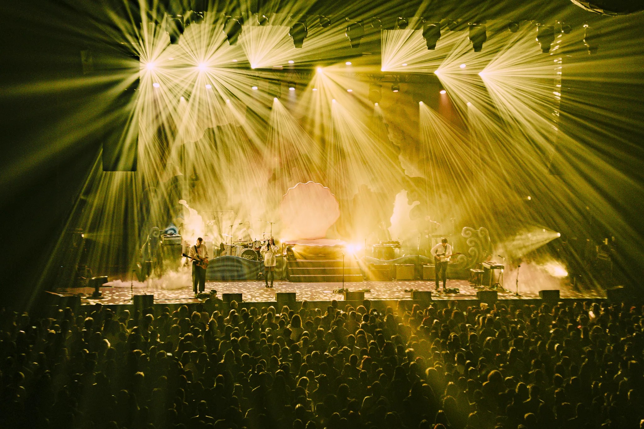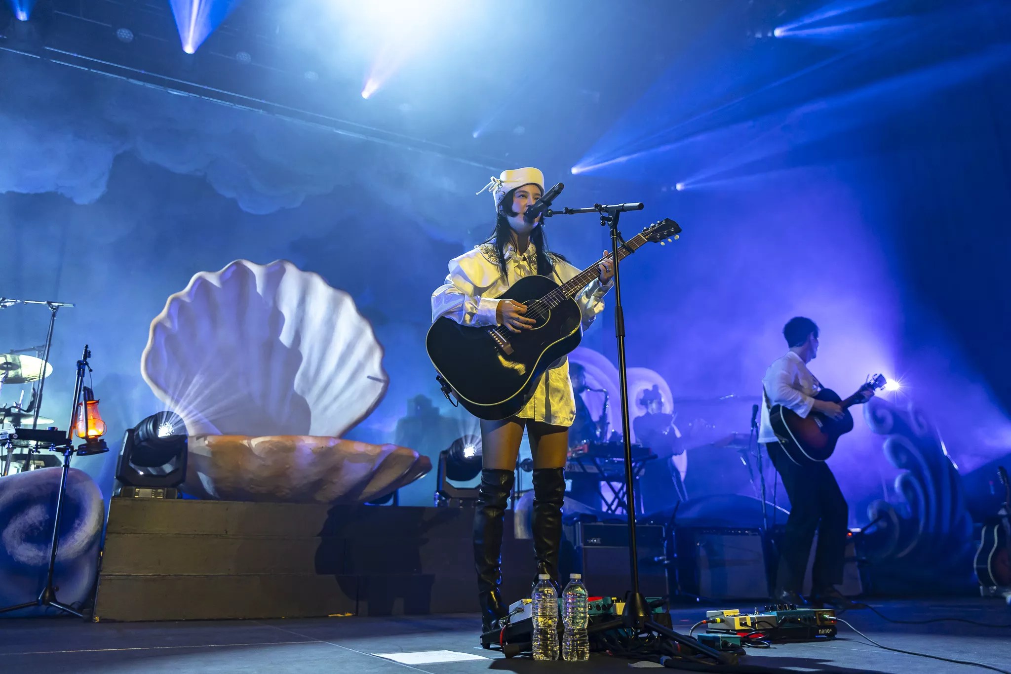 After a short break, Japanese Breakfast took the stage to a dreamy string intro in mostly total darkness, save for a lantern carried by Zauner. The nautical stage called back to the birth of the goddess Venus, with a giant pink clam in the center and large stage props painted to look like waves crashing around the outskirts of the stage, all in front of a massive, cloud-painted backdrop. As Zauner waltzed to perch on the front of the clam, the band opened with an impassioned live version of Melancholy opener, “Here is Someone.”