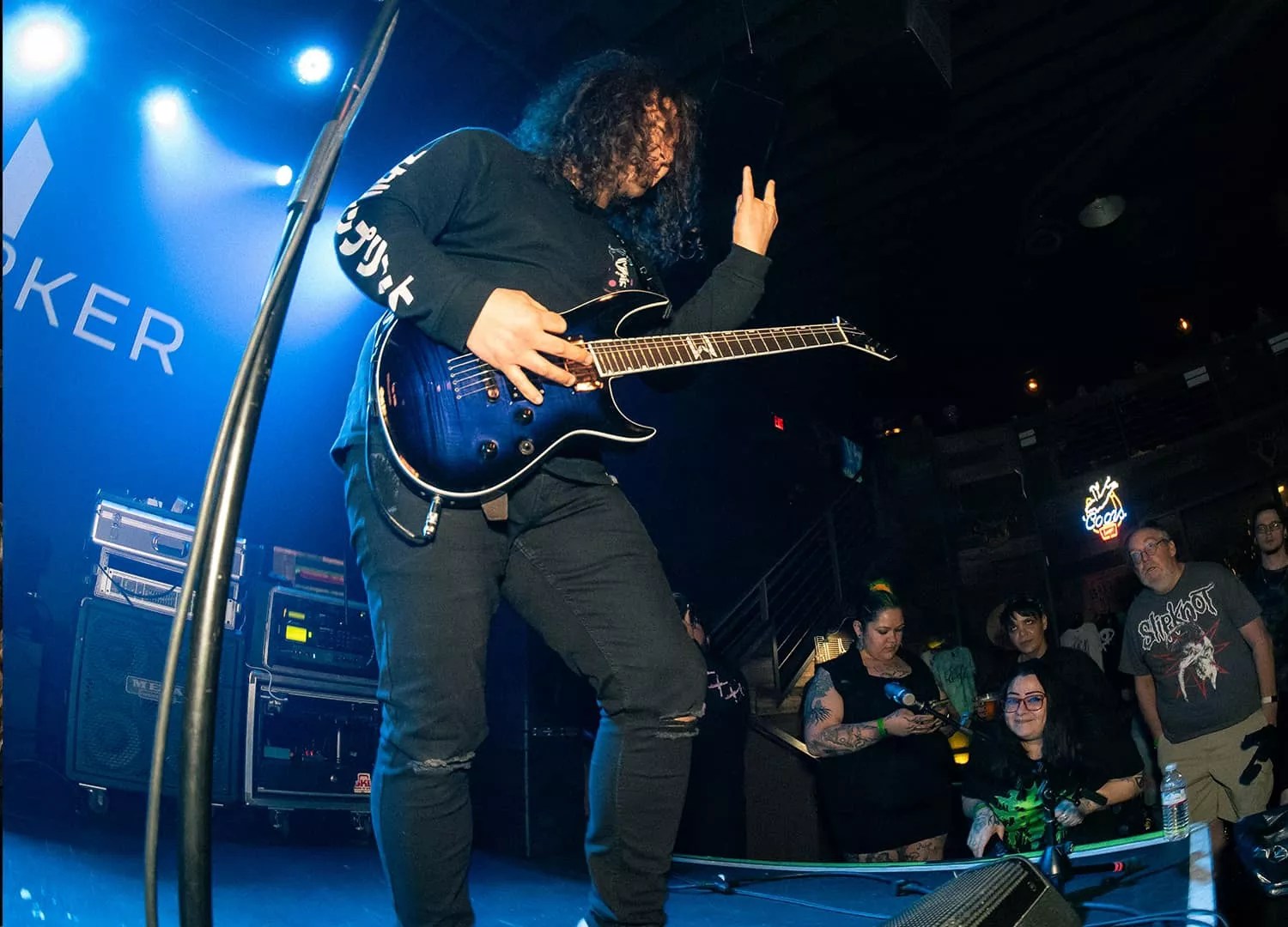 Lightworker guitarist Joe Calderon shows his appreciation for fans by throwing up the horns.