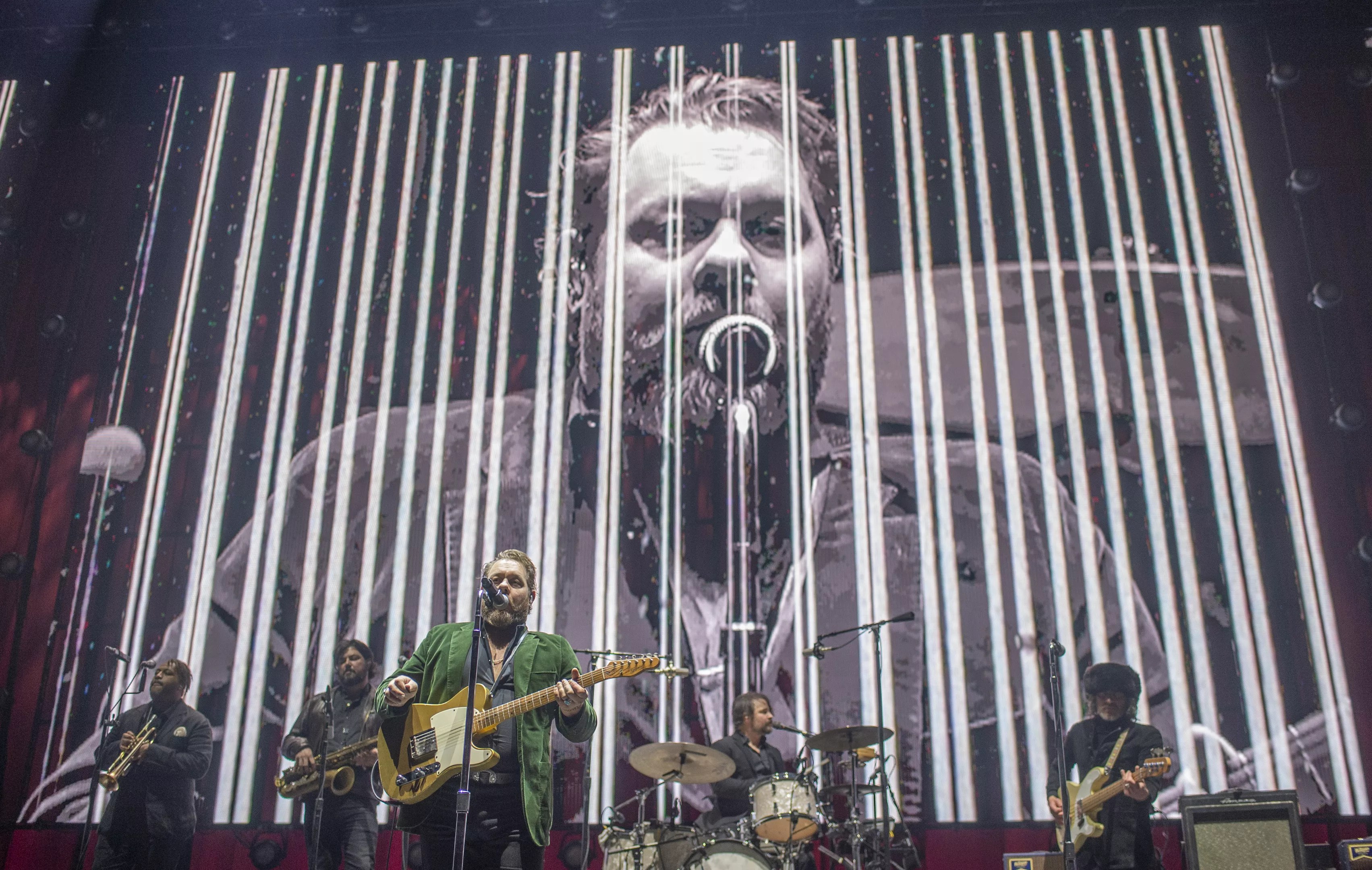 A thirty-foot-tall Orwellian Nathaniel Rateliff is projected on stage at Ball Arena.