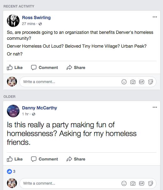 Soon after the comments and Westword sending an email to Party Guru to ask for clarification, both the comments and “homeless” and “vagrants” in the event’s description were deleted, as was this post: