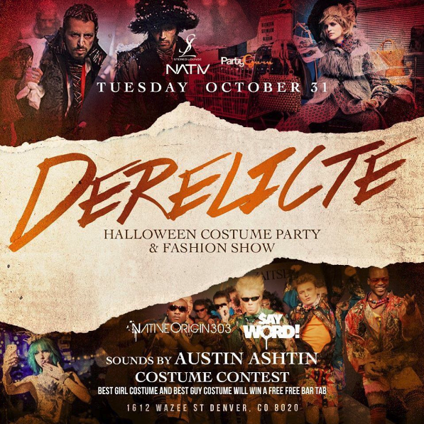 “Join us Tuesday October 31st for Derelicte’ at NATIV Hotel Denver! Derelicte’ is not only Mugatu’s signature revolutionary clothing line. Derelicte’ is a fashion, a way of life inspired by the very homeless and the vagrants that make this wonderful city so unique.
