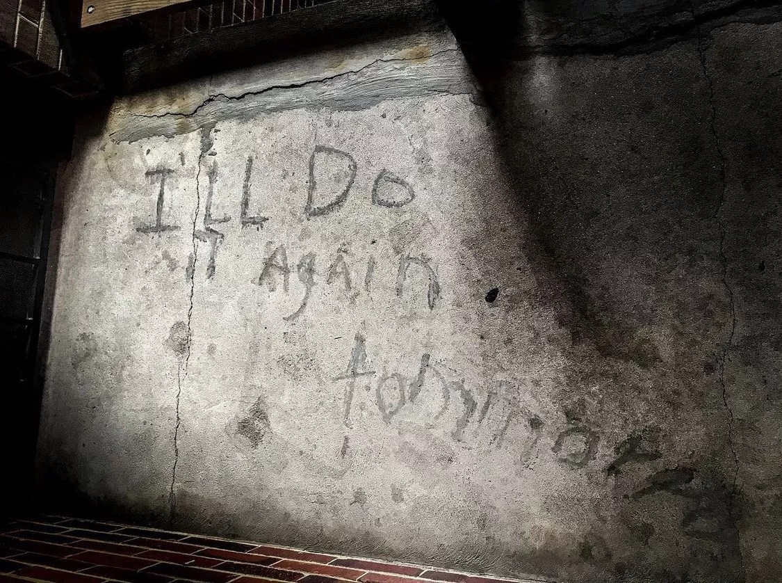 “At first it was very creepy,” Tryan recalls. “But then it became something I saw every day written in the cement. It was written in some sort of chemical that was removed and stained on the cement.”