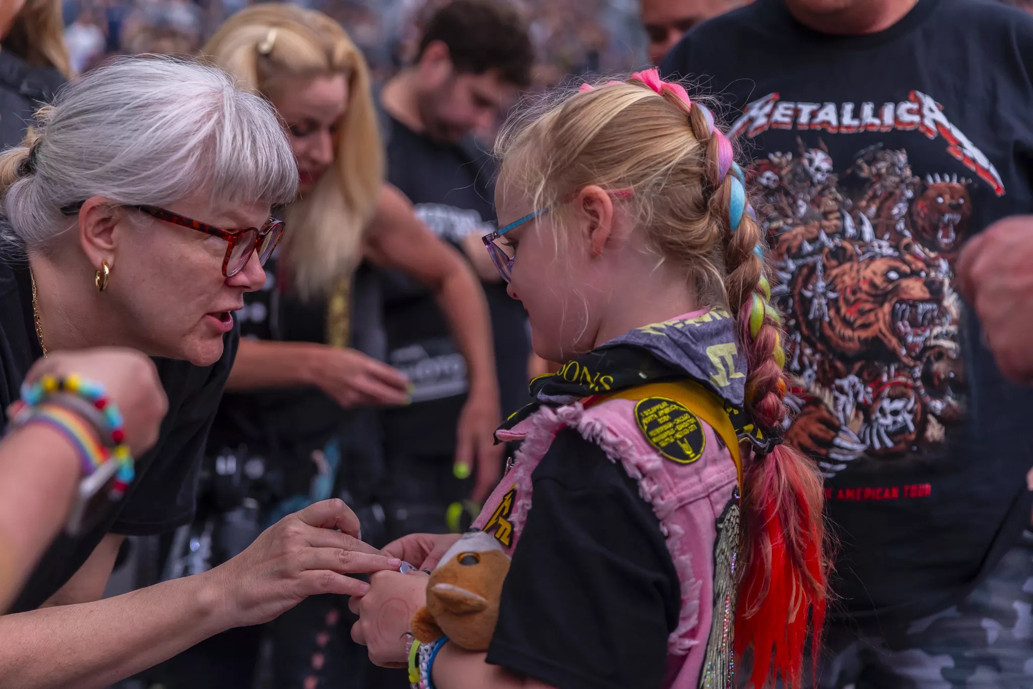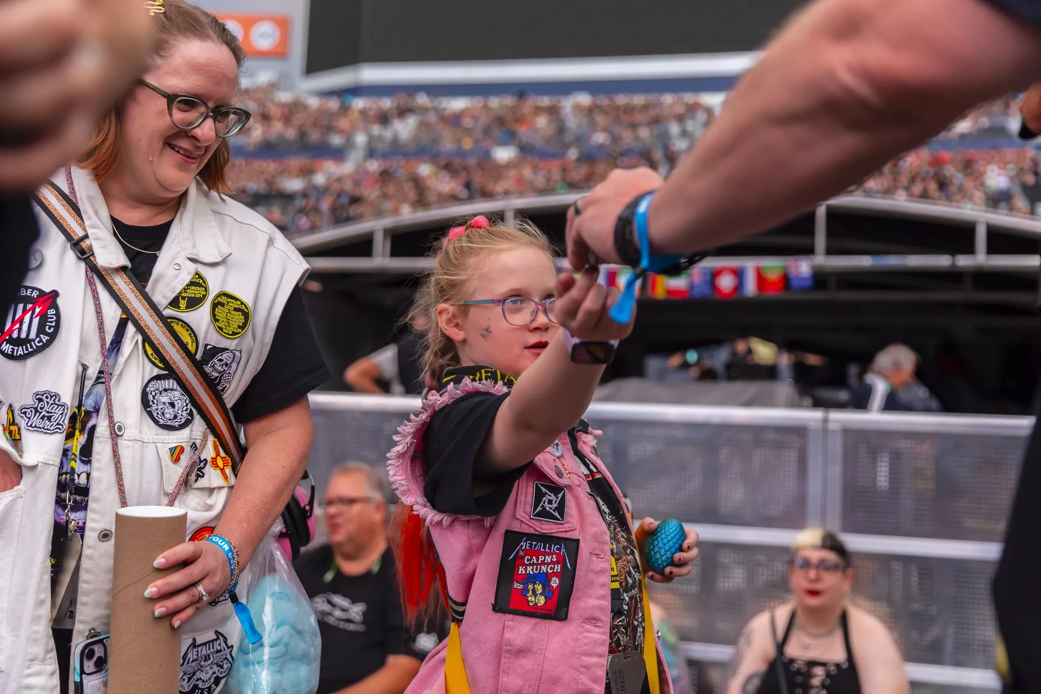 A young Metallica fan was handing out handmade buttons that featured her artwork.