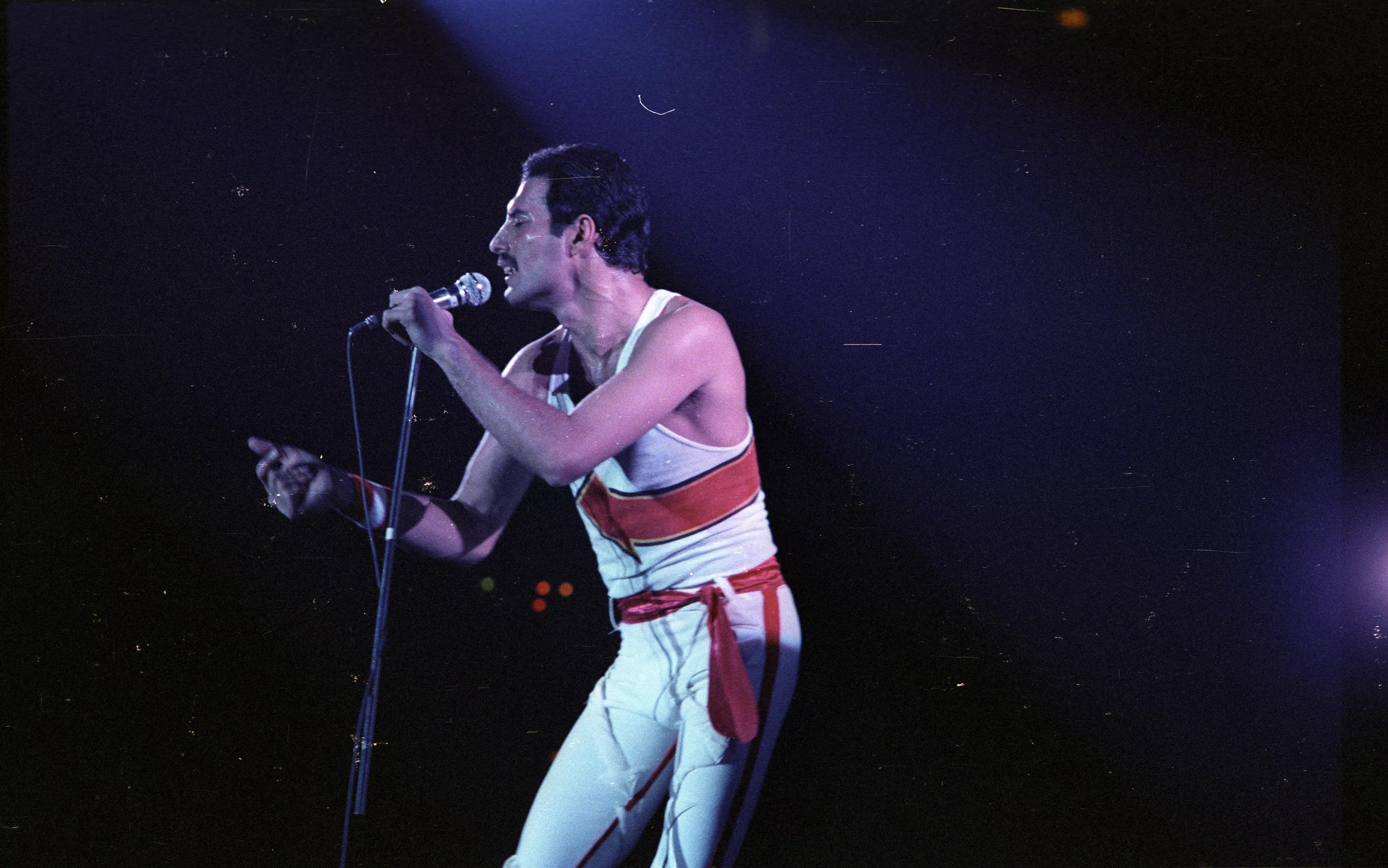 Freddie Mercury throws a bouquet of flowers to his fans.
