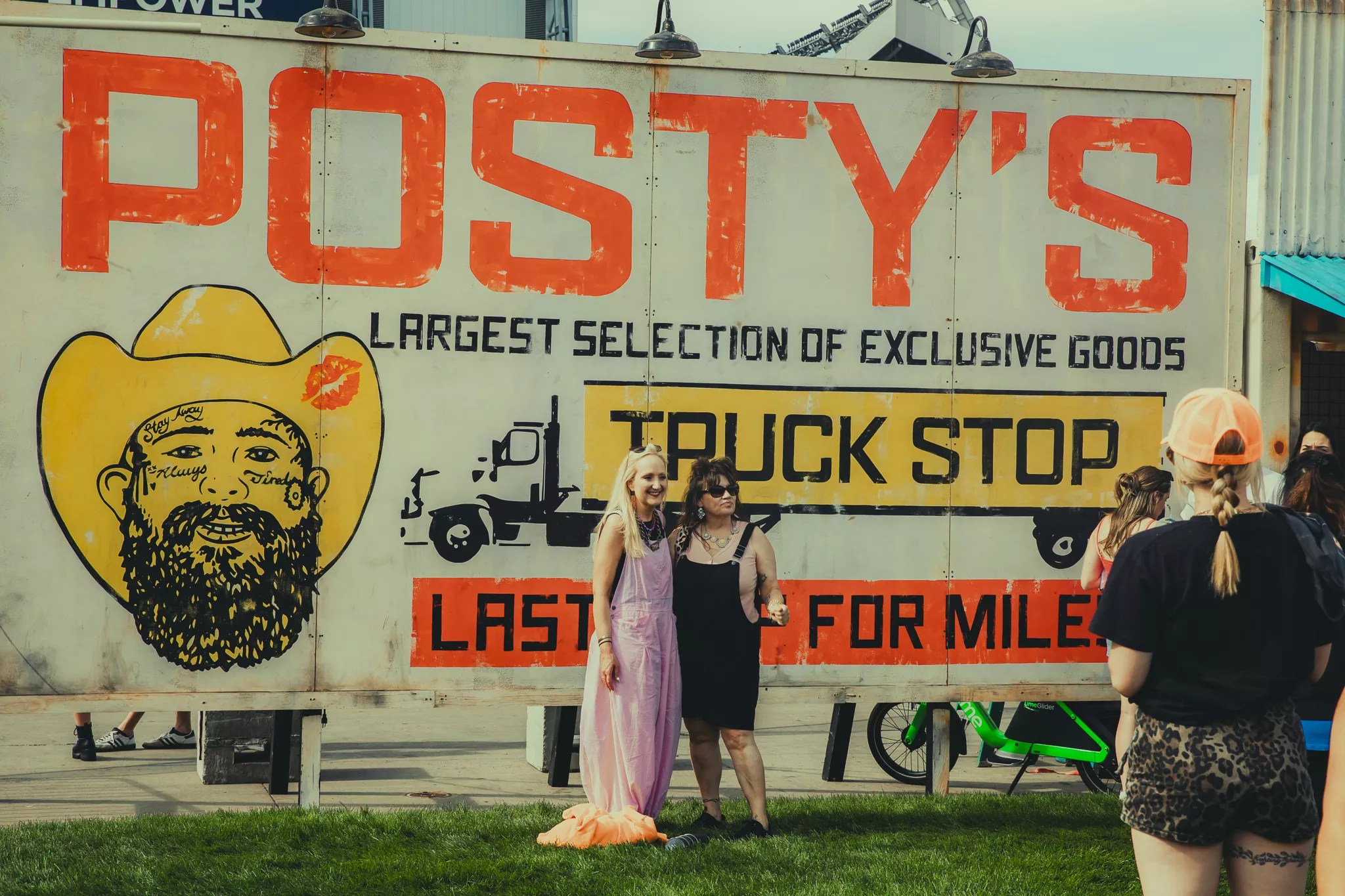 Fans pose for pictures at Post Malone’s travelin’ tailgate.