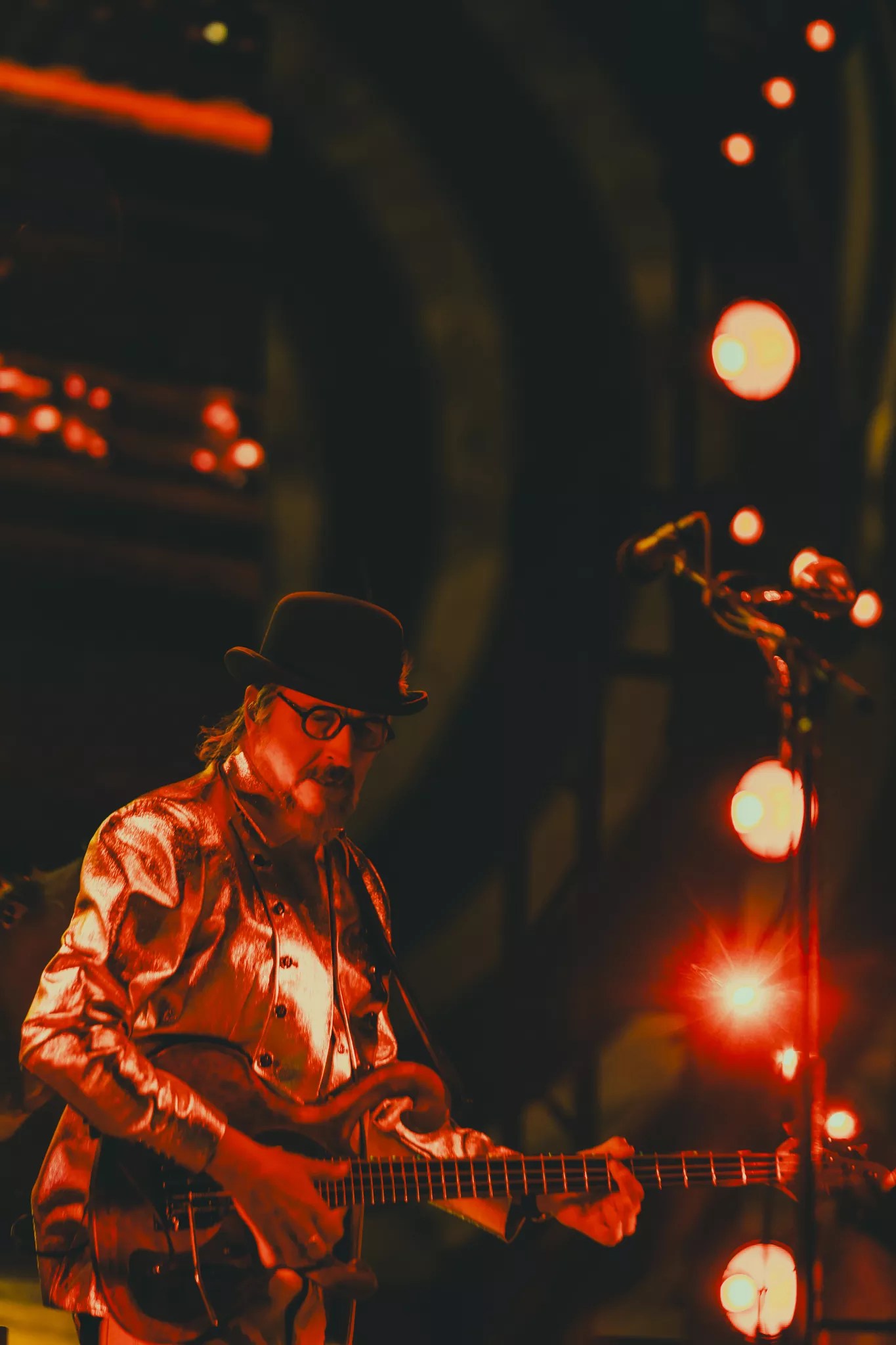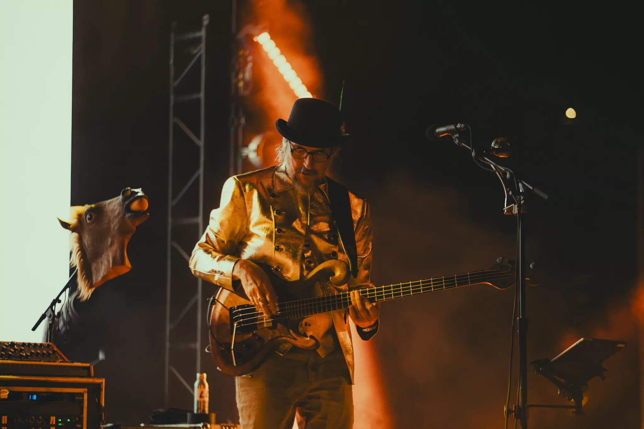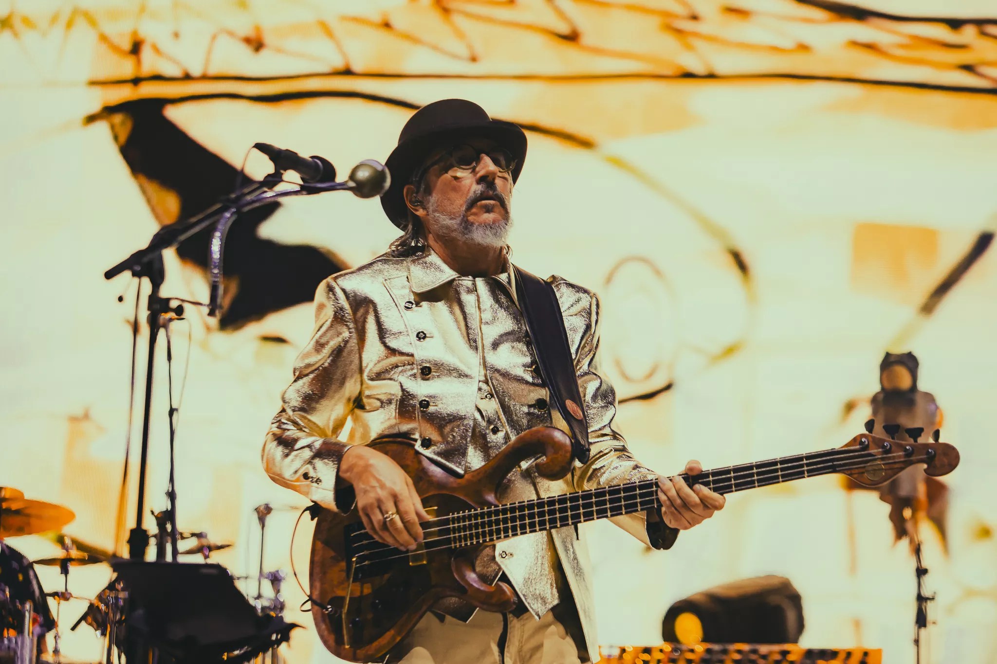 “So much shit has happened since the last time we met,” he said. Clad in a shining gold suit and a porkpie hat with a jaunty feather, he had one leg propped up on an amp, leaning over his bass as he surveyed the audience alongside his bandmates, guitarist Larry LaLonde and new drummer John Hoffman.