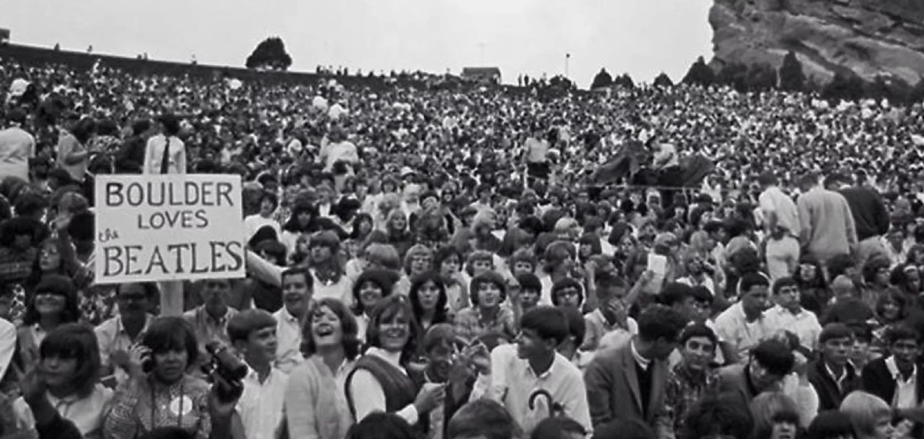 As the automobile boom began, the city began building up the venue, adding a five-mile scenic road through the park in 1930 and erecting the Trading Post the next year, where visitors could buy ice cream for a nickel. But the venue’s construction really got revved up in 1936 through the Civilian Conservation Corps and the Works Progress Administration, both part of President Franklin Roosevelt’s New Deal. Camping on the property, young men who were previously unemployed worked tirelessly to create the infrastructure of the amphitheater, which was designed by architect Burnham Hoyt to emulate the Theatre of Dionysus in Athens. Around 200 workers were paid $1 a day to excavate the property, removing 25,000 cubic yards of rock by blasting it away, then landscaping the rest. Hoyt planned the amphitheater in stages, revising the master plan as he familiarized himself with the land. The Beatles played their first and only Colorado show at Red Rocks Amphitheatre. Denver Arts & Venues