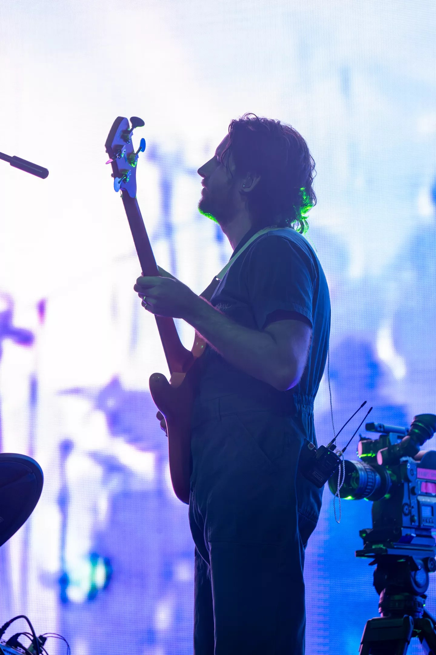 shows. It’s been so long, Mackenzie debuted a new twist on the 2014 track when he sprinkled in flute. Shortly after, he spotted a sign held by a fourteen-year-old fan named Callum and pulled him on stage, then handed him his signature Gibson Flying V guitar so the young axeman could fulfill his dream of playing “Superbug” with King Gizz. Stu Mackenzie playing the flute during the “Nathan” portion of the set. Ross Jones