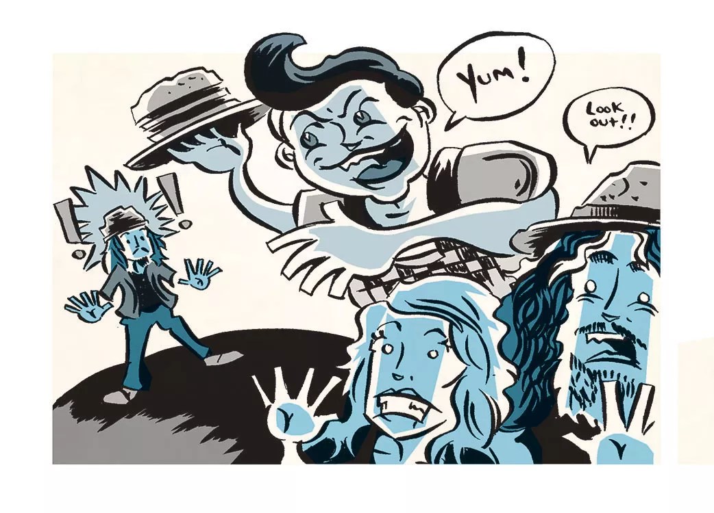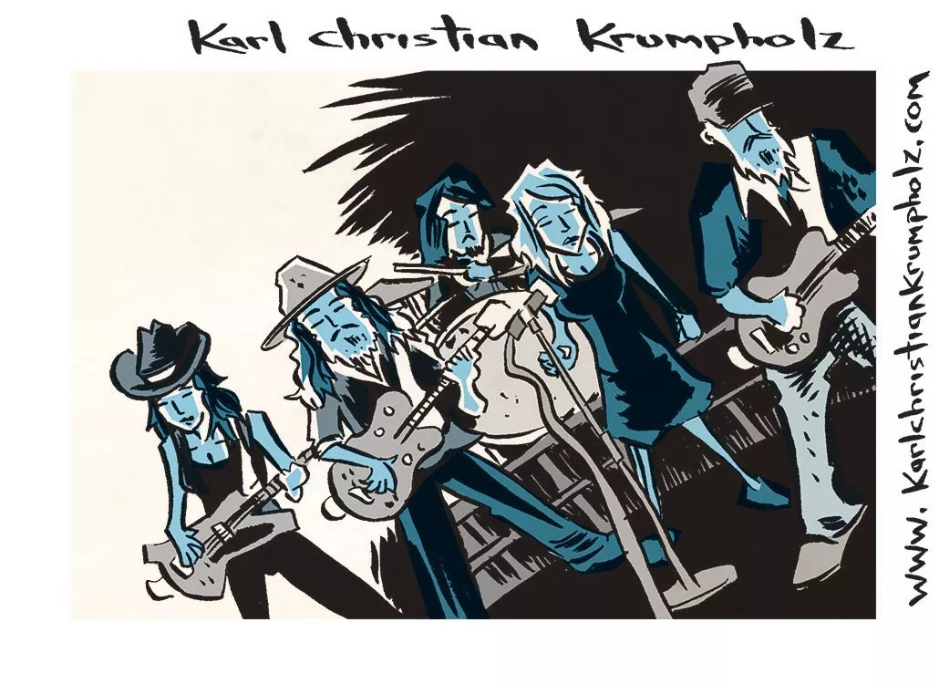 Ryan Chrys: “The Rough Cuts are heading out on tour, and our drummer, Michael Jochum, is eating for two again. Michael has been a professional touring musician for almost forty years, and has played with legends like Bruce Springsteen, Barbra Streisand, Jackson Browne and Korn. Over the course of his career, it has been suggested that his body has somehow developed a symbiotic relationship with the road. Photographic evidence, documented by yours truly, has shown that, indeed, Michael is actually being consumed by the road, bit by bit, flesh by flesh. Karl Christian Krumpholz Photos of Michael lying in the road being ever so slowly consumed – sometimes at historical landmarks and sometimes literally in the middle of nowhere – randomly appear on the band’s Facebook page. These images depict how the road nibbles on Michael’s flesh, unbeknownst to him as the band travels. Of course, the Rough Cuts look out for each other, so they concluded that if Michael eats two helpings at each meal, he can compensate for the parts of him that the road consumes. It may seem odd – and it is – yet the band rolls on. Karl Christian Krumpholz
