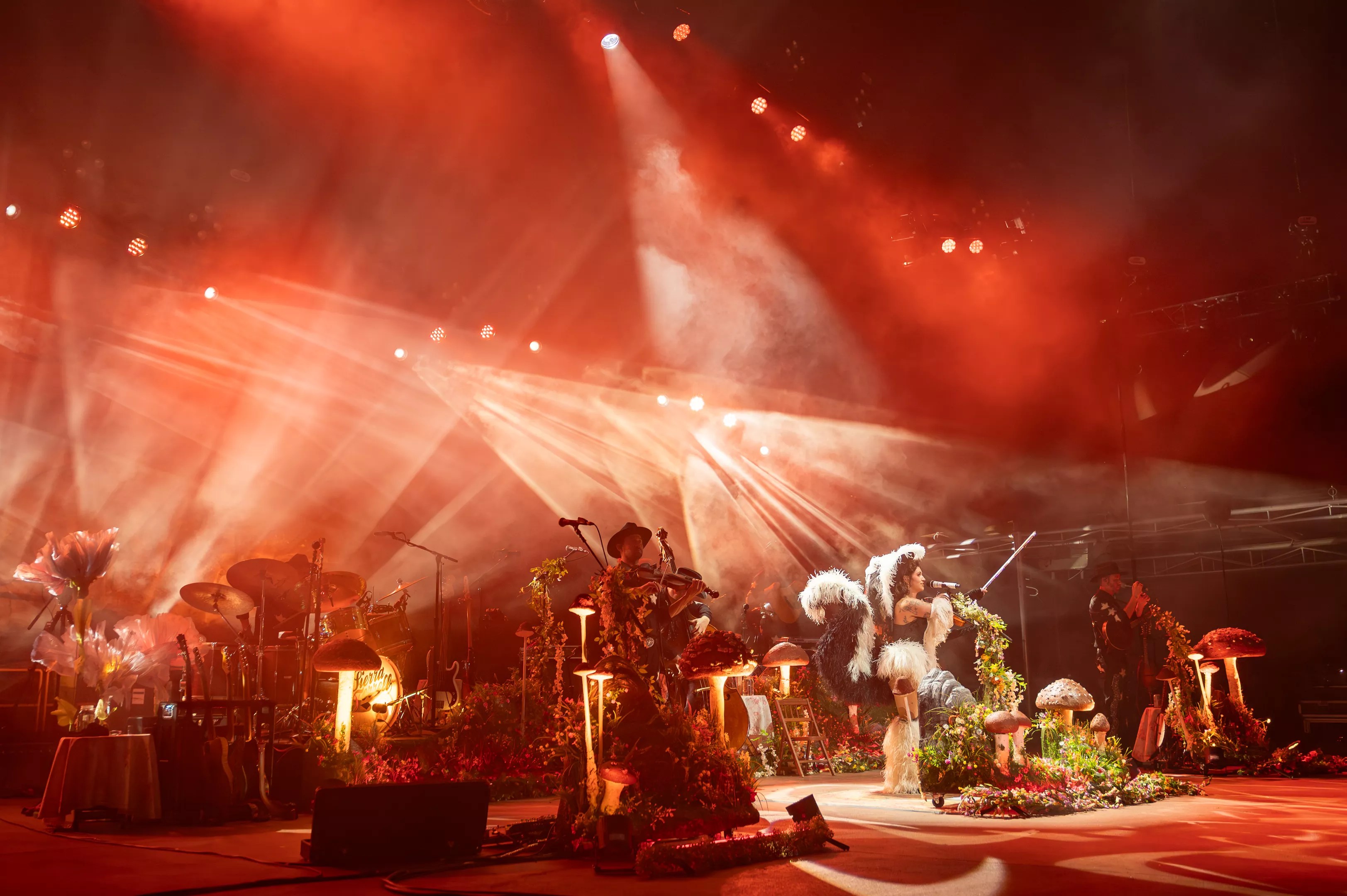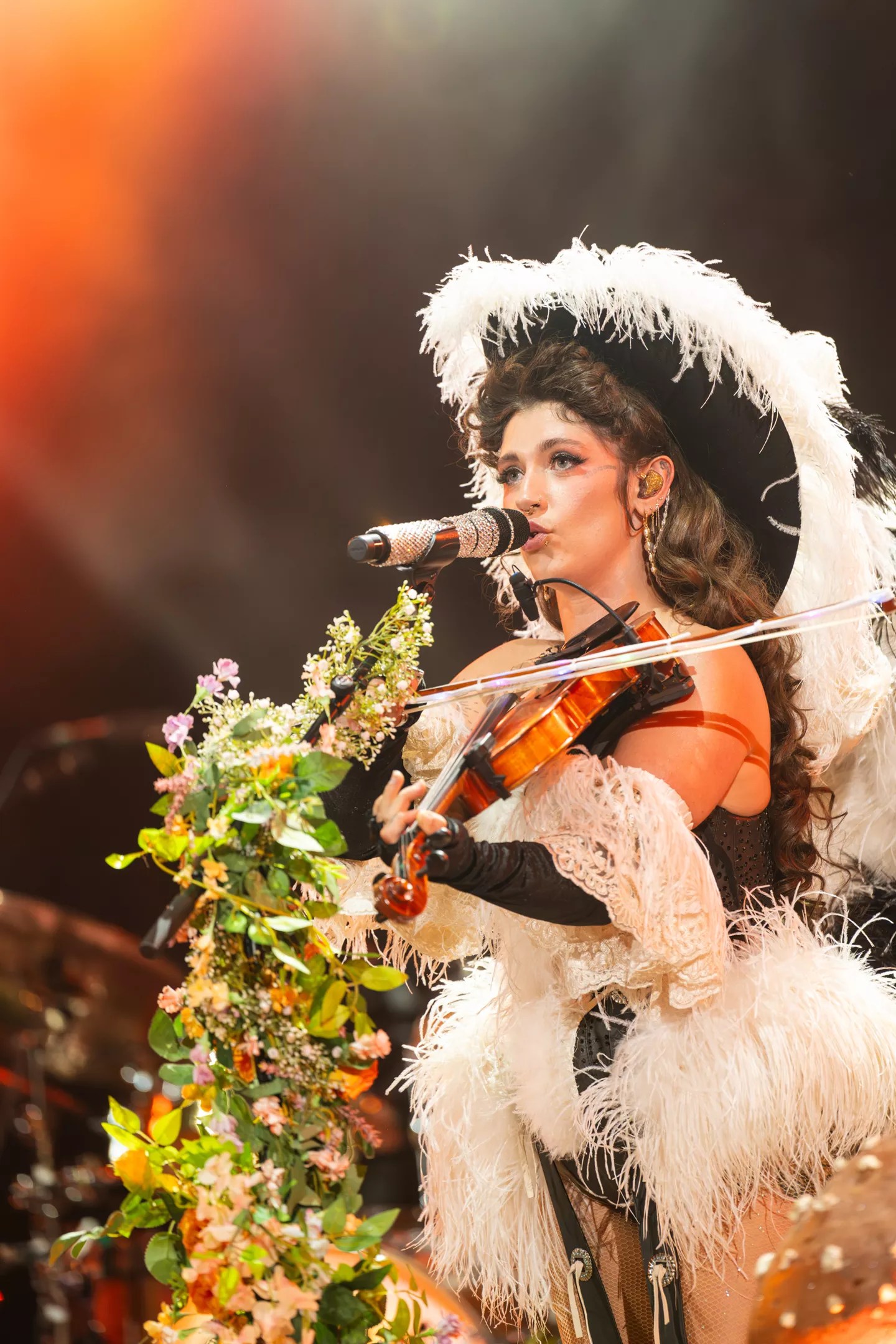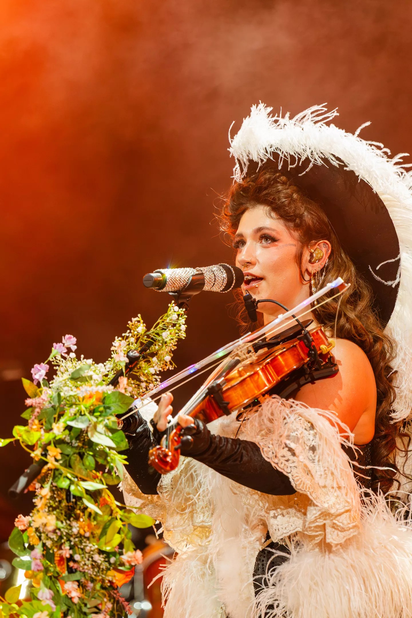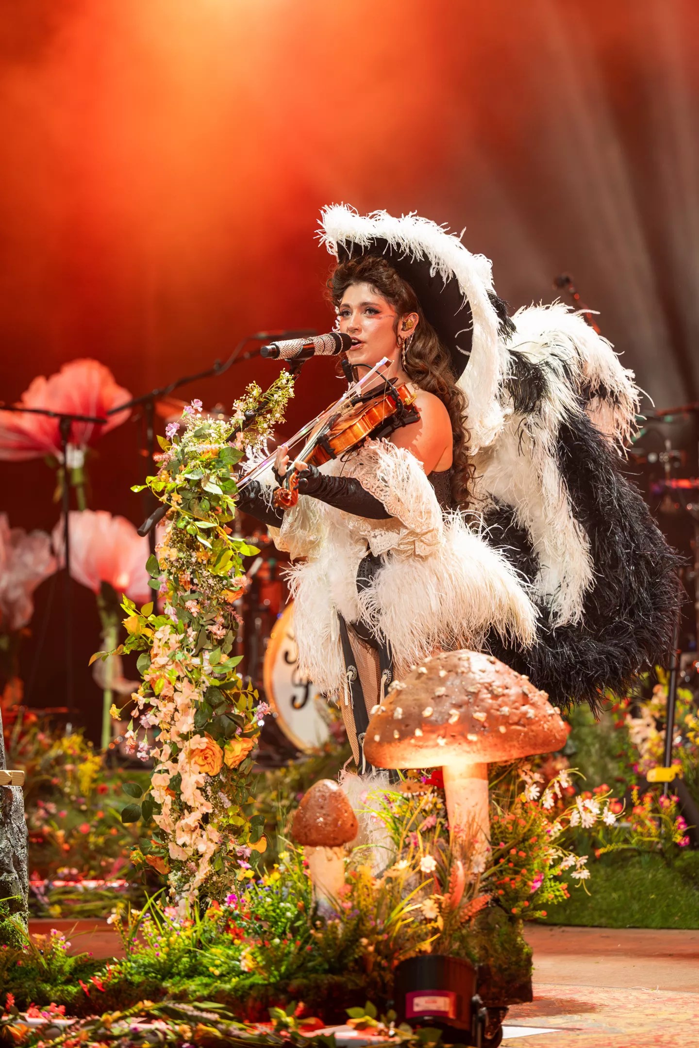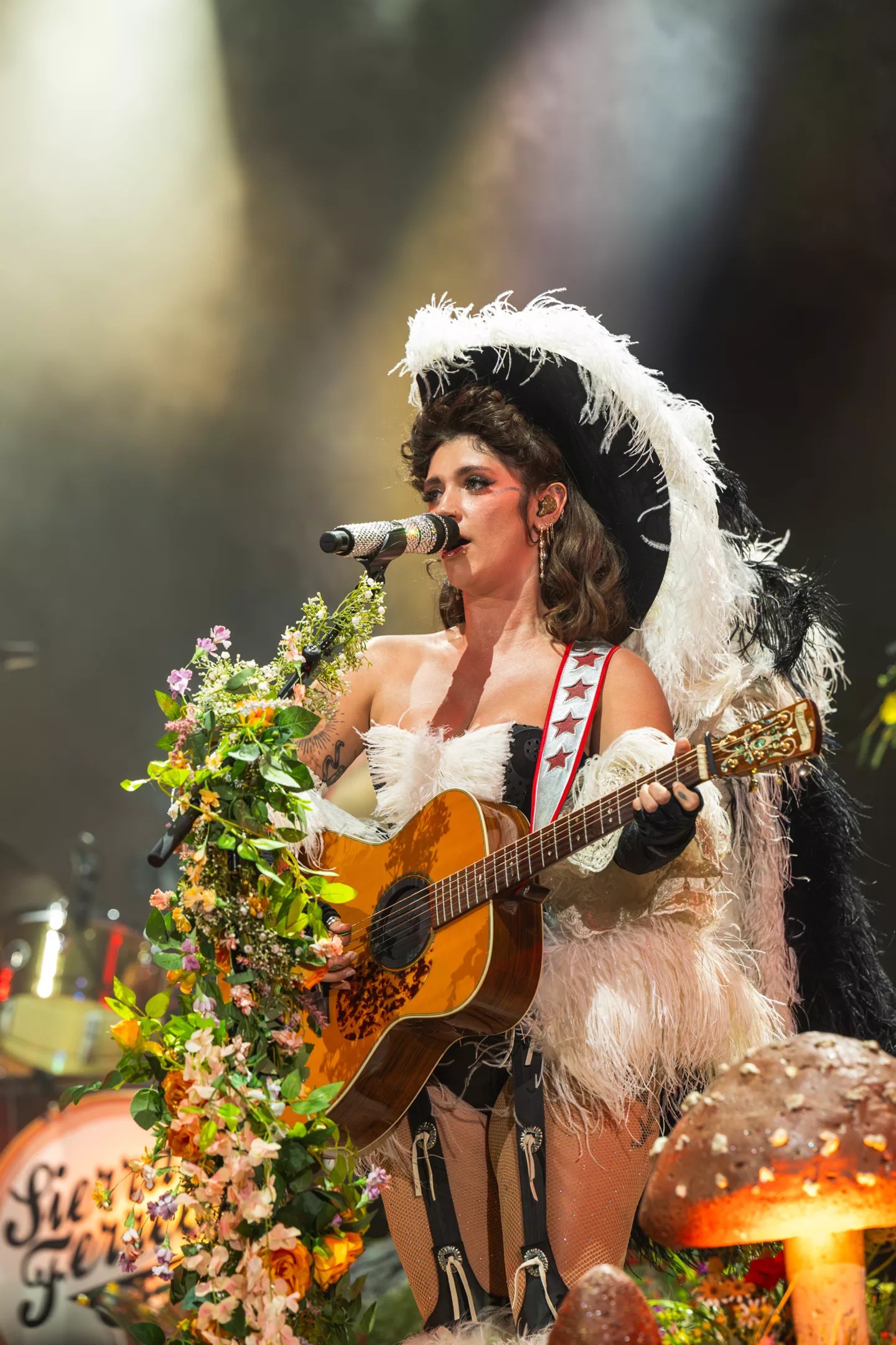 Sierra Ferrell brought her aptly named Shoot for the Moon Tour to Red Rocks on August 28 for her first headlining performance at the legendary venue. The Americana-country sensation took the stage, which was transformed into a flowery garden, in a spectacular skunk-styled outfit, opening with fan favorite “I Can Drive You Crazy.”
