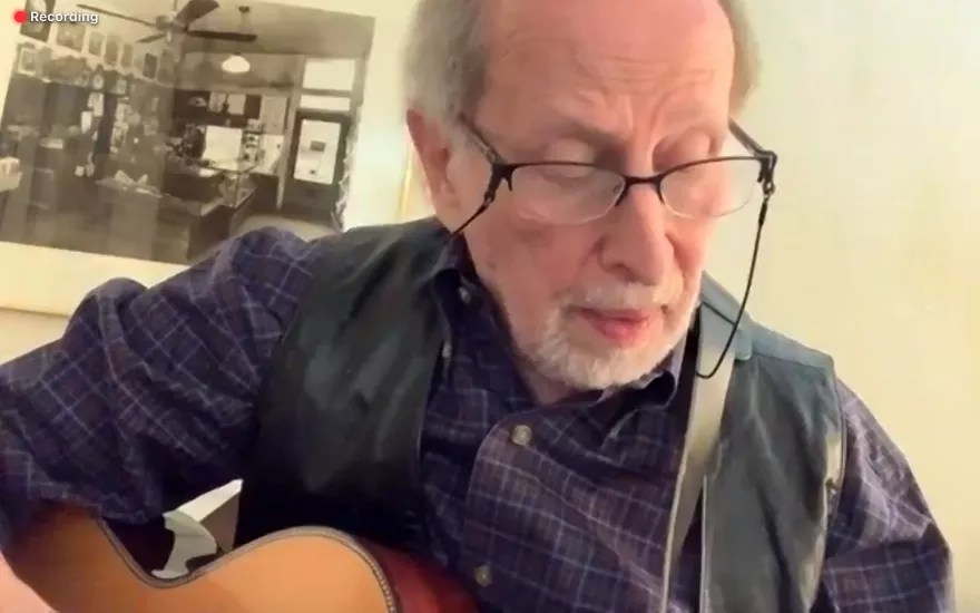 The fridge behind him is covered with photos and magnets, and he peers into his computer’s video camera toward an online audience of about seventy people attending a recent Friday night Old-Fashioned Hootenanny hosted by Swallow Hill Music over Zoom. He pauses to explain how he learned “Oh, Lord, I’ve Got Some Singing to Do” in 1957, during his days at Oberlin College.