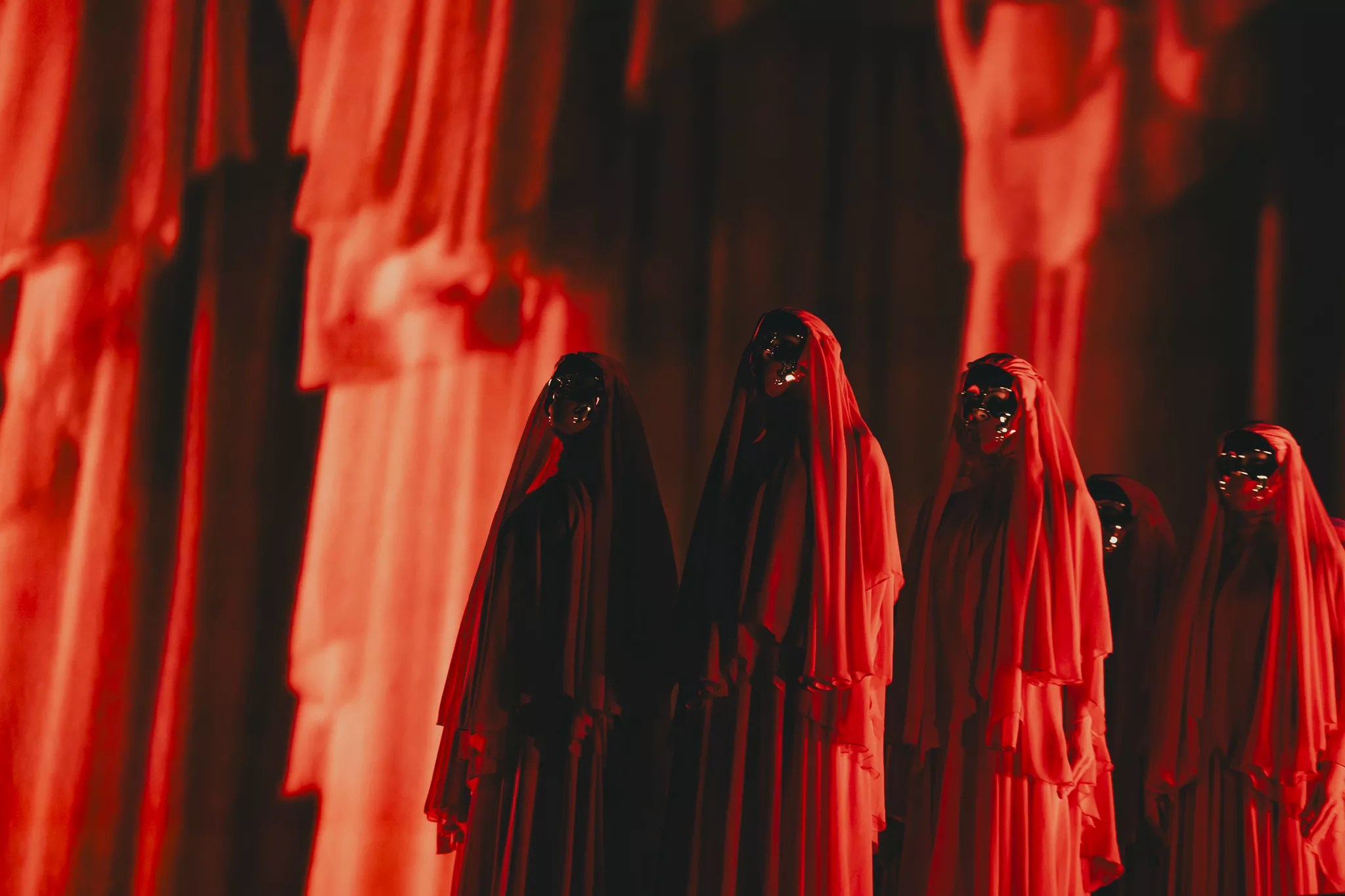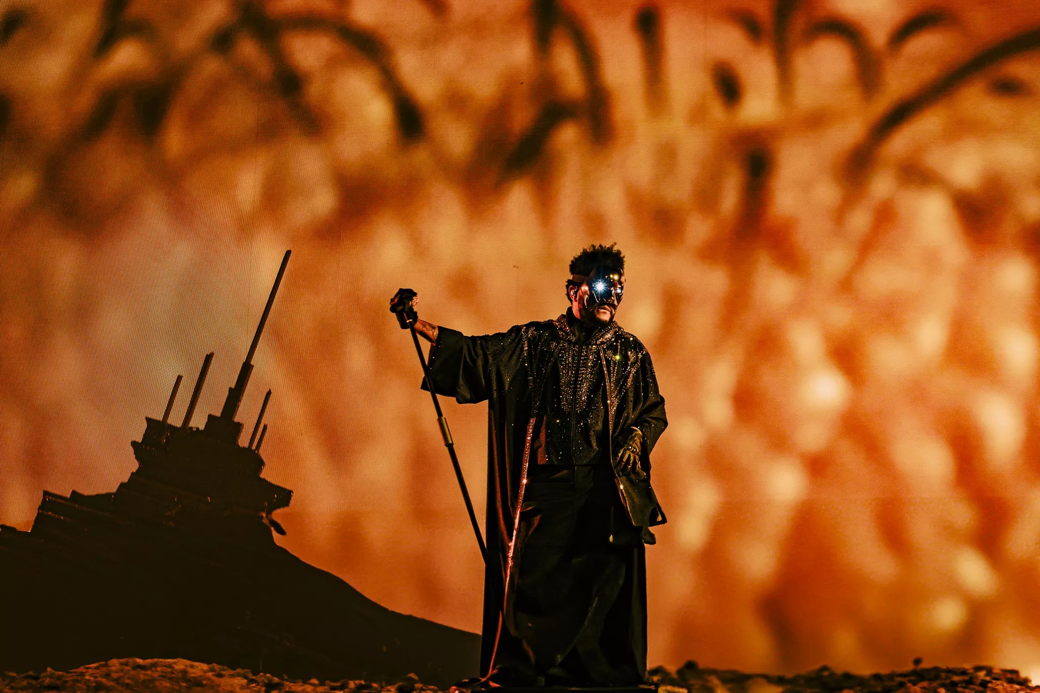 The Weeknd’s stage design often includes futuristic cityscapes and dystopian imagery.