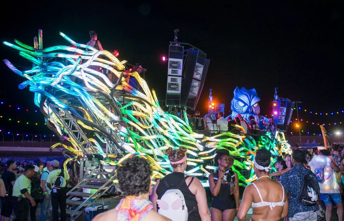 Electric Daisy Carnival’s newest addition, the Parliament Art Car, is parked outside the gates of the festival’s massive Kinetic Field stage. An exclusive group of partygoers have been admitted onto the second-story dance floor of the open-air, triple-decker bus. They’re drinking from the private bar’s red Solo cups and dancing to headliner Troyboi’s trap beats as they reverberate from the car’s boisterous Funktion-One sound system. The party has spilled out onto the hard pavement of the Las Vegas Motor Speedway, and a copious crowd of dancers are disrupting the flow of fans headed to see Tiesto.